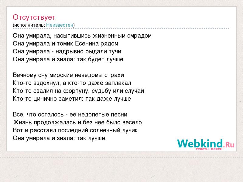 Она умирала, насытившись жизненным смрадом Она умирала и томик Есенина рядом Она умирала - надрывно рыдали тучи Она умирала и знала: так будет лучше Вечному сну мирские неведомы страхи Кто-то вздохнул, а кто-то даже заплакал Кто-то свалил на фортуну, судьбу или случай Кто-то цинично заметил: так даже лучше Все, что осталось - ее недопетые песни Жизнь продолжалась и без нее было весело Вот и расстаял последний солнечный лучик Она умирала и знала: так лучше.
