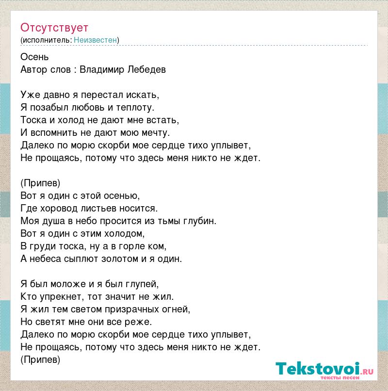 Осень Автор слов : Владимир Лебедев Уже давно я перестал искать, Я позабыл любовь и теплоту. Тоска и холод не дают мне встать, И вспомнить не дают мою мечту. Далеко по морю скорби мое сердце тихо уплывет, Не прощаясь, потому что здесь меня никто не ждет. (Припев) Вот я один с этой осенью, Где хоровод листьев носится. Моя душа в небо просится из тьмы глубин. Вот я один с этим холодом, В груди тоска, ну а в горле ком, А небеса сыплют золотом и я один. Я был моложе и я был глупей, Кто упрекнет, тот значит не жил. Я жил тем светом призрачных огней, Но светят мне они все реже. Далеко по морю скорби мое сердце тихо уплывет, Не прощаясь, потому что здесь меня никто не ждет. (Припев)