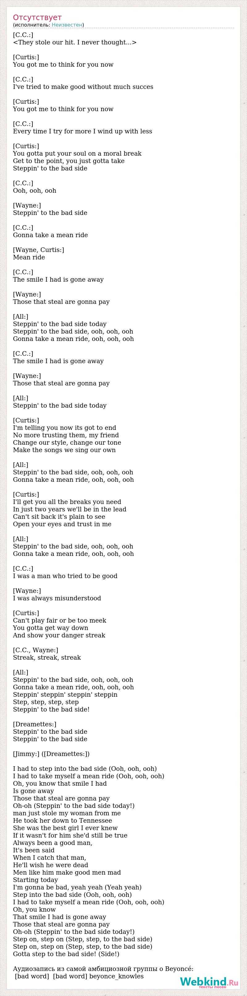[C.C.:] <They stole our hit. I never thought...> [Curtis:] You got me to think for you now [C.C.:] I've tried to make good without much succes [Curtis:] You got me to think for you now [C.C.:] Every time I try for more I wind up with less [Curtis:] You gotta put your soul on a moral break Get to the point, you just gotta take Steppin' to the bad side [C.C.:] Ooh, ooh, ooh [Wayne:] Steppin' to the bad side [C.C.:] Gonna take a mean ride [Wayne, Curtis:] Mean ride [C.C.:] The smile I had is gone away [Wayne:] Those that steal are gonna pay [All:] Steppin' to the bad side today Steppin' to the bad side, ooh, ooh, ooh Gonna take a mean ride, ooh, ooh, ooh [C.C.:] The smile I had is gone away [Wayne:] Those that steal are gonna pay [All:] Steppin' to the bad side today [Curtis:] I'm telling you now its got to end No more [bad word] them, my friend Change our style, change our tone Make the songs we sing our own [All:] Steppin' to the bad side, ooh, ooh, ooh Gonna take a mean ride, ooh, ooh, ooh [Curtis:] I'll get you all the breaks you need In just two years we'll be in the lead Can't sit back it's plain to see Open your eyes and [bad word] in me [All:] Steppin' to the bad side, ooh, ooh, ooh Gonna take a mean ride, ooh, ooh, ooh [C.C.:] I was a man who tried to be good [Wayne:] I was always misunderstood [Curtis:] Can't play fair or be too meek You gotta get way down And show your danger streak [C.C., Wayne:] Streak, streak, streak [All:] Steppin' to the bad side, ooh, ooh, ooh Gonna take a mean ride, ooh, ooh, ooh Steppin' steppin' steppin' steppin Step, step, step, step Steppin' to the bad side! [Dreamettes:] Steppin' to the bad side Steppin' to the bad side [Jimmy:] ([Dreamettes:]) I had to step into the bad side (Ooh, ooh, ooh) I had to take myself a mean ride (Ooh, ooh, ooh) Oh, you know that smile I had Is gone away Those that steal are gonna pay Oh-oh (Steppin' to the bad side today!) man just stole my woman from me He took her down to Tennessee She was the best girl I ever knew If it wasn't for him she'd still be [bad word] Always been a good man, It's been said When I catch that man, He'll wish he were dead Men like him make good men mad Starting today I'm gonna be bad, yeah yeah (Yeah yeah) Step into the bad side (Ooh, ooh, ooh) I had to take myself a mean ride (Ooh, ooh, ooh) Oh, you know That smile I had is gone away Those that steal are gonna pay Oh-oh (Steppin' to the bad side today!) Step on, step on (Step, step, to the bad side) Step on, step on (Step, step, to the bad side) Gotta step to the bad side! (Side!) Аудиозапись из самой амбициозной группы о Beyoncé: [bad word] [bad word] beyonce_knowles