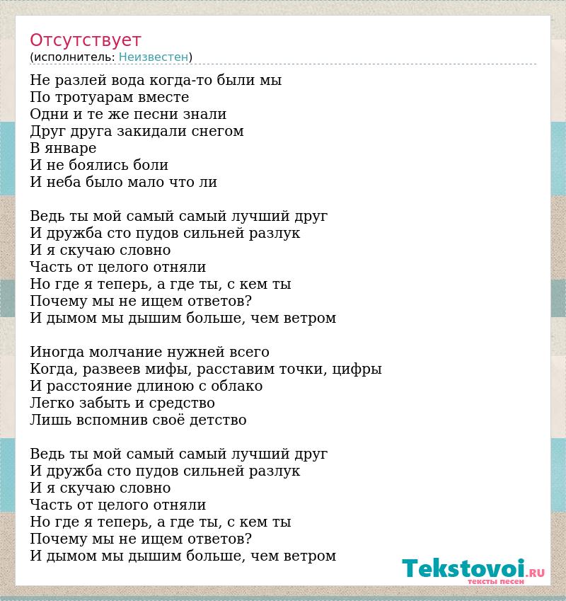 Не разлей вода когда-то были мы По тротуарам вместе Одни и те же песни знали Друг друга закидали снегом В январе И не боялись боли И неба было мало что ли Ведь ты мой самый самый лучший друг И дружба сто пудов сильней разлук И я скучаю словно Часть от целого отняли Но где я теперь, а где ты, с кем ты Почему мы не ищем ответов? И дымом мы дышим больше, чем ветром Иногда молчание нужней всего Когда, развеев мифы, расставим точки, цифры И расстояние длиною с облако Легко забыть и средство Лишь вспомнив своё детство Ведь ты мой самый самый лучший друг И дружба сто пудов сильней разлук И я скучаю словно Часть от целого отняли Но где я теперь, а где ты, с кем ты Почему мы не ищем ответов? И дымом мы дышим больше, чем ветром