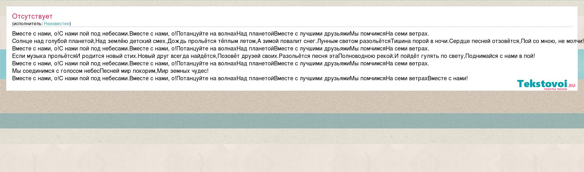 Вместе с нами, о!С нами пой под небесами.Вместе с нами, о!Потанцуйте на волнахНад планетойВместе с лучшими друзьямиМы помчимсяНа семи ветрах. Солнце над голубой планетой,Над землёю детский смех.Дождь прольётся тёплым летом,А зимой повалит снег.Лунным светом разольётсяТишина порой в ночи.Сердце песней отзовётся,Пой со мною, не молчи! Вместе с нами, о!С нами пой под небесами.Вместе с нами, о!Потанцуйте на волнахНад планетойВместе с лучшими друзьямиМы помчимсяНа семи ветрах. Если музыка прольётсяИ родится новый стих.Новый друг всегда найдётся,Позовёт друзей своих.Разольётся песня этаПолноводною рекой.И пойдёт гулять по свету,Поднимайся с нами в пой! Вместе с нами, о!С нами пой под небесами.Вместе с нами, о!Потанцуйте на волнахНад планетойВместе с лучшими друзьямиМы помчимсяНа семи ветрах. Мы соединимся с голосом небесПесней мир покорим,Мир земных чудес! Вместе с нами, о!С нами пой под небесами.Вместе с нами, о!Потанцуйте на волнахНад планетойВместе с лучшими друзьямиМы помчимсяНа семи ветрахВместе с нами!