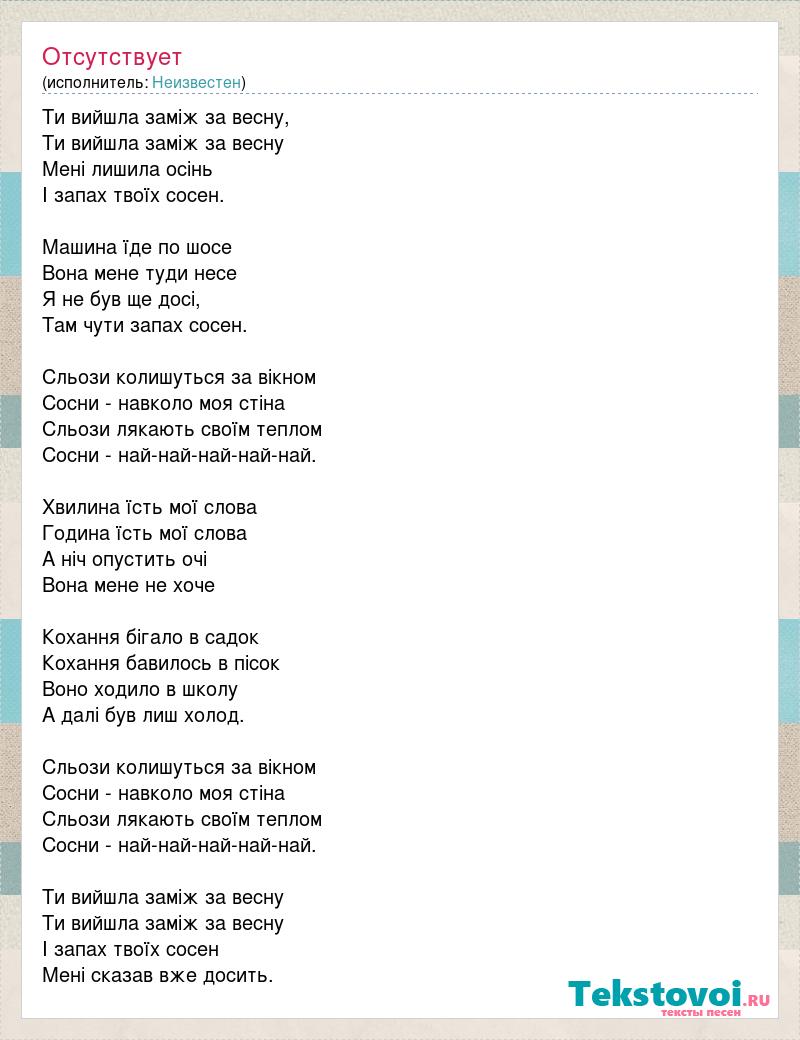 Ти вийшла замiж за весну, Ти вийшла замiж за весну Менi лишила осiнь I запах твоїх сосен. Машина їде по шосе Вона мене туди несе Я не був ще досi, Там чути запах сосен. Сльози колишуться за вiкном Сосни - навколо моя стiна Сльози лякають своїм теплом Сосни - най-най-най-най-най. Хвилина їсть мої слова Година їсть мої слова А нiч опустить очi Вона мене не хоче Кохання бiгало в садок Кохання бавилось в пiсок Воно ходило в школу А далi був лиш холод. Сльози колишуться за вiкном Сосни - навколо моя стiна Сльози лякають своїм теплом Сосни - най-най-най-най-най. Ти вийшла замiж за весну Ти вийшла замiж за весну I запах твоїх сосен Менi сказав вже досить.