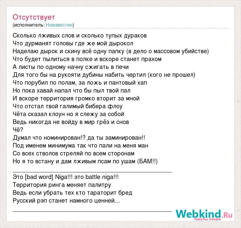 Сколько лживых слов и сколько тупых дураков Что дурманят головы где же мой дырокол Наделаю дырок и скину всё одну папку (в дело о массовом убийстве) Что будет пылиться в полке и вскоре станет прахом А листы по одному начну сжигать в печи Для того бы на рукояти дубины набить чертил (кого не прошел) Что порубил по полам, за ложь и пантовый хап Но пока хавай напал что бы пыл твой пал И вскоре территория громко вторит за мной Что отстал твой галимый бибера флоу Чёта сказал клоун но я слежу за собой Ведь никогда не войду в мир грёз и снов Чё? Думал что номинирован!? да ты заминирован!! Под именем минимума так что пали на меня ман Со всех стволов стреляй по всем сторонам Но я то встану и дам лживым псам по ушам (БАМ!!) ________________________________________________ Это [bad word] Niga!!! это battle niga!!! Территория ринга меняет палитру Ведь если убрать тех кто тараторит бред Русский рэп станет намного ценней... ________________________________________________