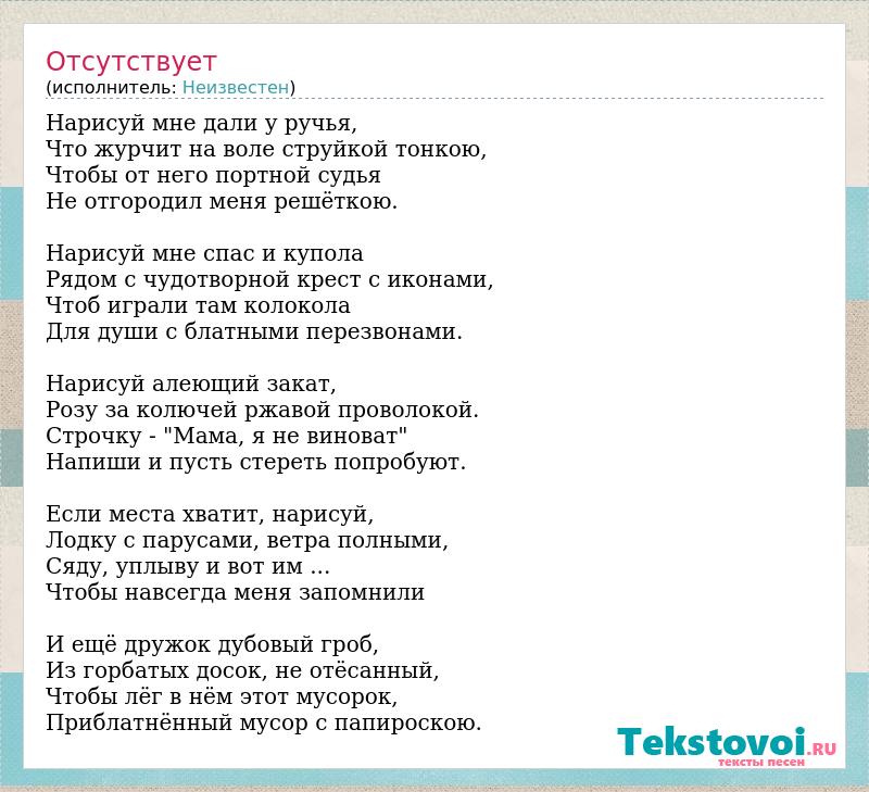 Нарисуй мне дали у ручья, Что журчит на воле струйкой тонкою, Чтобы от него портной судья Не отгородил меня решёткою. Нарисуй мне спас и купола Рядом с чудотворной крест с иконами, Чтоб играли там колокола Для души с блатными перезвонами. Нарисуй алеющий закат, Розу за колючей ржавой проволокой. Строчку - "Мама, я не виноват" Напиши и пусть стереть попробуют. Если места хватит, нарисуй, Лодку с парусами, ветра полными, Сяду, уплыву и вот им ... Чтобы навсегда меня запомнили И ещё дружок дубовый гроб, Из горбатых досок, не отёсанный, Чтобы лёг в нём этот мусорок, Приблатнённый мусор с папироскою.