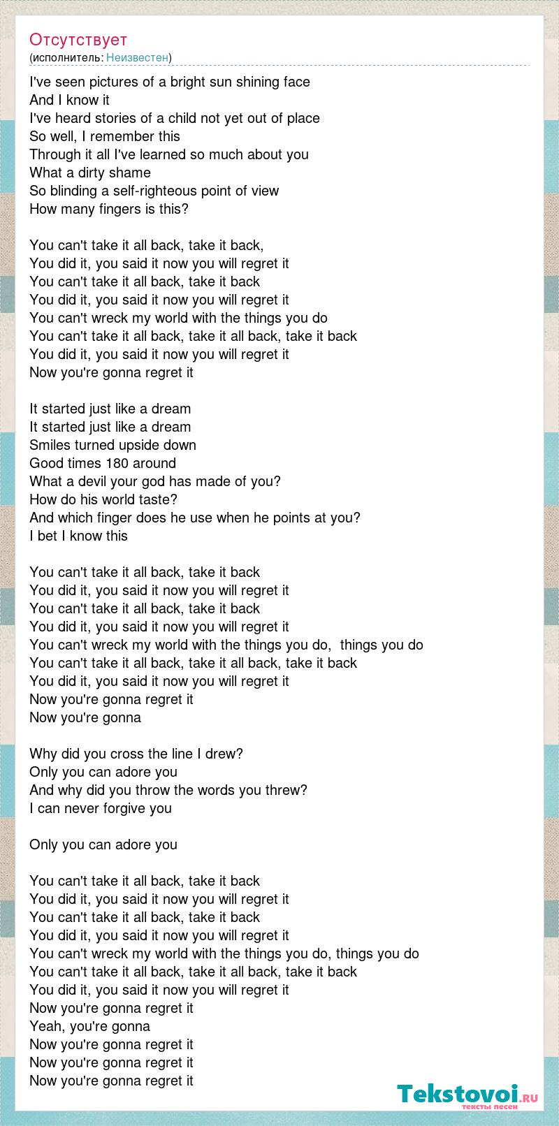 I've seen pictures of a bright sun shining face And I know it I've heard stories of a child not yet out of place So well, I remember this Through it all I've learned so much about you What a dirty shame So blinding a self-righteous point of view How many fingers is this? You can't take it all back, take it back, You did it, you said it now you will regret it You can't take it all back, take it back You did it, you said it now you will regret it You can't wreck my world with the things you do You can't take it all back, take it all back, take it back You did it, you said it now you will regret it Now you're gonna regret it It started just like a dream It started just like a dream Smiles turned upside down Good times 180 around What a devil your god has made of you? How do his world taste? And which finger does he use when he points at you? I bet I know this You can't take it all back, take it back You did it, you said it now you will regret it You can't take it all back, take it back You did it, you said it now you will regret it You can't wreck my world with the things you do, things you do You can't take it all back, take it all back, take it back You did it, you said it now you will regret it Now you're gonna regret it Now you're gonna Why did you cross the line I drew? Only you can adore you And why did you throw the words you threw? I can never forgive you Only you can adore you You can't take it all back, take it back You did it, you said it now you will regret it You can't take it all back, take it back You did it, you said it now you will regret it You can't wreck my world with the things you do, things you do You can't take it all back, take it all back, take it back You did it, you said it now you will regret it Now you're gonna regret it Yeah, you're gonna Now you're gonna regret it Now you're gonna regret it Now you're gonna regret it