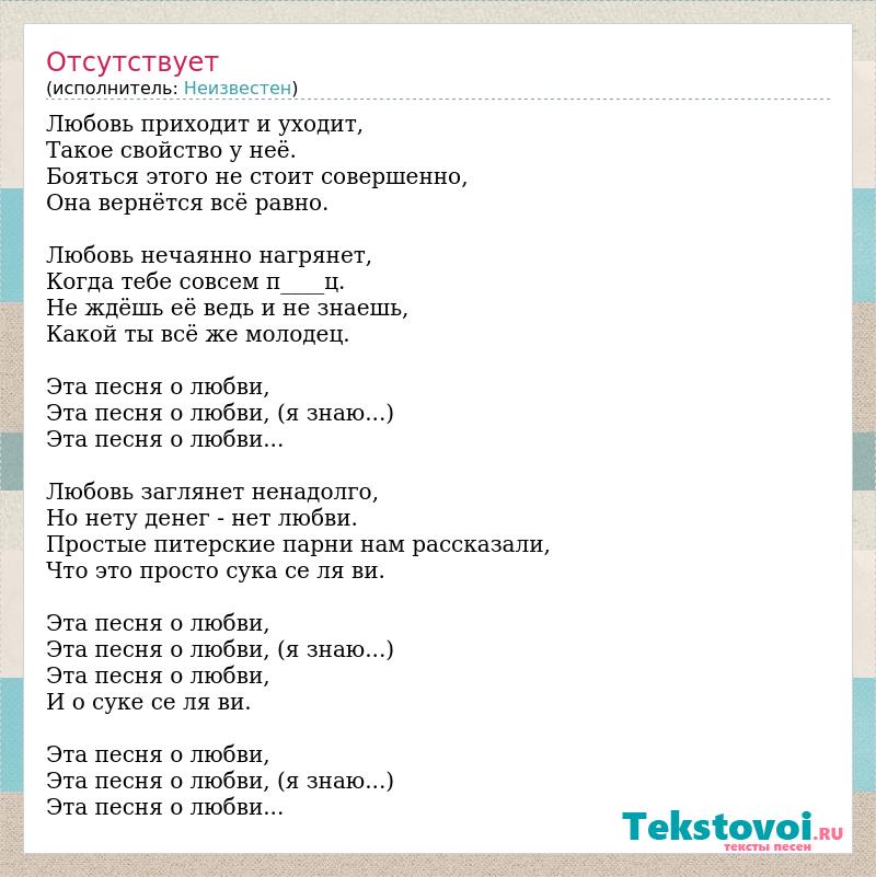 Любовь приходит и уходит, Такое свойство у неё. Бояться этого не стоит совершенно, Она вернётся всё равно. Любовь нечаянно нагрянет, Когда тебе совсем п____ц. Не ждёшь её ведь и не знаешь, Какой ты всё же молодец. Эта песня о любви, Эта песня о любви, (я знаю...) Эта песня о любви... Любовь заглянет ненадолго, Но нету денег - нет любви. Простые питерские парни нам рассказали, Что это просто сука се ля ви. Эта песня о любви, Эта песня о любви, (я знаю...) Эта песня о любви, И о суке се ля ви. Эта песня о любви, Эта песня о любви, (я знаю...) Эта песня о любви...