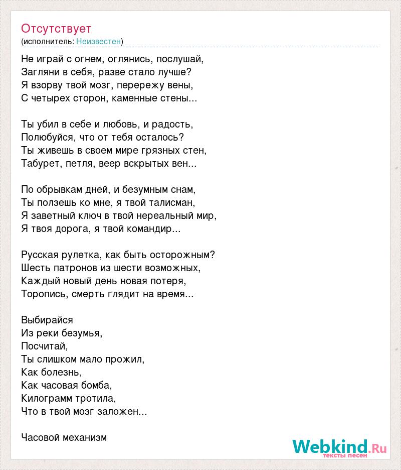 Не играй с огнем, оглянись, послушай, Загляни в себя, разве стало лучше? Я взорву твой мозг, перережу вены, С четырех сторон, каменные стены... Ты убил в себе и любовь, и радость, Полюбуйся, что от тебя осталось? Ты живешь в своем мире грязных стен, Табурет, петля, веер вскрытых вен... По обрывкам дней, и безумным снам, Ты ползешь ко мне, я твой талисман, Я заветный ключ в твой нереальный мир, Я твоя дорога, я твой командир... Русская рулетка, как быть осторожным? Шесть патронов из шести возможных, Каждый новый день новая потеря, Торопись, смерть глядит на время... Выбирайся Из реки безумья, Посчитай, Ты слишком мало прожил, Как болезнь, Как часовая бомба, Килограмм тротила, Что в твой мозг заложен... Часовой механизм