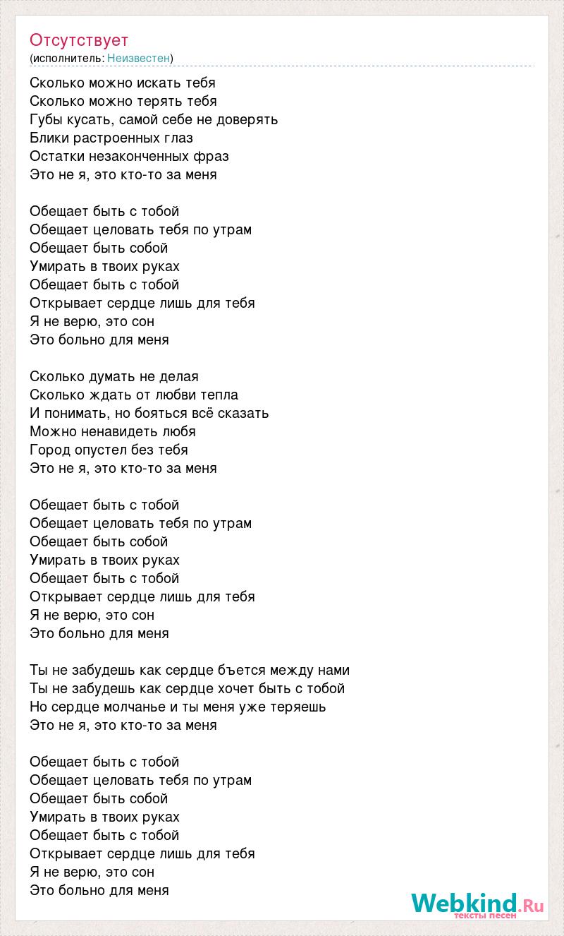 Сколько можно искать тебя Сколько можно терять тебя Губы кусать, самой себе не доверять Блики растроенных глаз Остатки незаконченных фраз Это не я, это кто-то за меня Обещает быть с тобой Обещает целовать тебя по утрам Обещает быть собой Умирать в твоих руках Обещает быть с тобой Открывает сердце лишь для тебя Я не верю, это сон Это больно для меня Сколько думать не делая Сколько ждать от любви тепла И понимать, но бояться всё сказать Можно ненавидеть любя Город опустел без тебя Это не я, это кто-то за меня Обещает быть с тобой Обещает целовать тебя по утрам Обещает быть собой Умирать в твоих руках Обещает быть с тобой Открывает сердце лишь для тебя Я не верю, это сон Это больно для меня Ты не забудешь как сердце бъется между нами Ты не забудешь как сердце хочет быть с тобой Но сердце молчанье и ты меня уже теряешь Это не я, это кто-то за меня Обещает быть с тобой Обещает целовать тебя по утрам Обещает быть собой Умирать в твоих руках Обещает быть с тобой Открывает сердце лишь для тебя Я не верю, это сон Это больно для меня