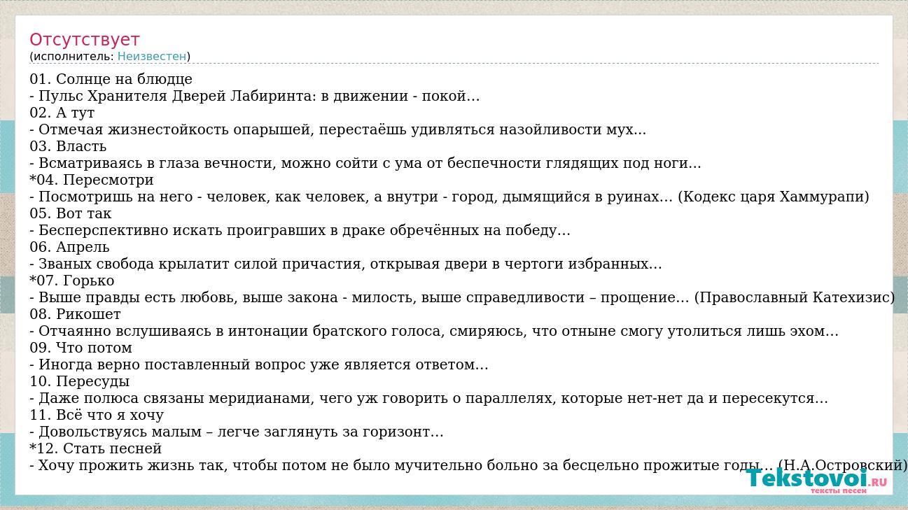 01. Солнце на блюдце - Пульс Хранителя Дверей Лабиринта: в движении - покой… 02. А тут - Отмечая жизнестойкость опарышей, перестаёшь удивляться назойливости мух... 03. Власть - Всматриваясь в глаза вечности, можно сойти с ума от беспечности глядящих под ноги... *04. Пересмотри - Посмотришь на него - человек, как человек, а внутри - город, дымящийся в руинах… (Кодекс царя Хаммурапи) 05. Вот так - Бесперспективно искать проигравших в драке обречённых на победу… 06. Апрель - Званых свобода крылатит силой причастия, открывая двери в чертоги избранных… *07. Горько - Выше правды есть любовь, выше закона - милость, выше справедливости – прощение… (Православный Катехизис) 08. Рикошет - Отчаянно вслушиваясь в интонации братского голоса, смиряюсь, что отныне смогу утолиться лишь эхом… 09. Что потом - Иногда верно поставленный вопрос уже является ответом… 10. Пересуды - Даже полюса связаны меридианами, чего уж говорить о параллелях, которые нет-нет да и пересекутся… 11. Всё что я хочу - Довольствуясь малым – легче заглянуть за горизонт… *12. Стать песней - Хочу прожить жизнь так, чтобы потом не было мучительно больно за бесцельно прожитые годы… (Н.А.Островский)