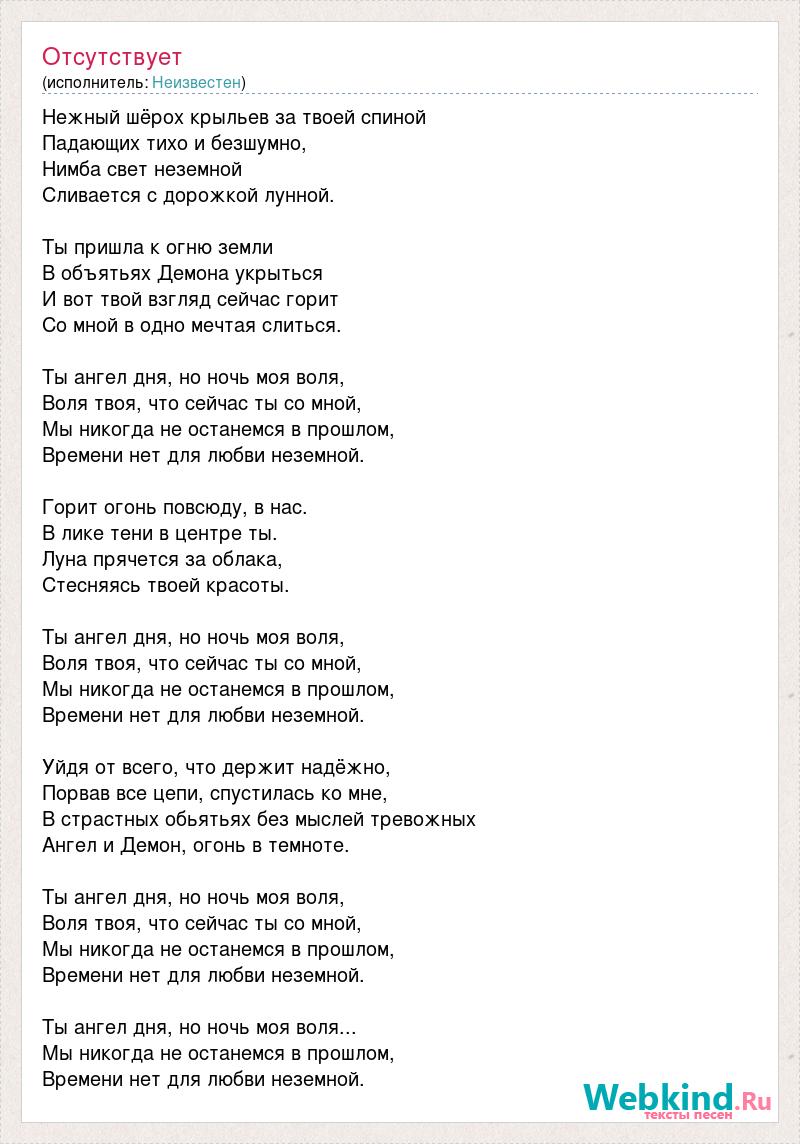 Нежный шёрох крыльев за твоей спиной Падающих тихо и безшумно, Нимба свет неземной Сливается с дорожкой лунной. Ты пришла к огню земли В объятьях Демона укрыться И вот твой взгляд сейчас горит Со мной в одно мечтая слиться. Ты ангел дня, но ночь моя воля, Воля твоя, что сейчас ты со мной, Мы никогда не останемся в прошлом, Времени нет для любви неземной. Горит огонь повсюду, в нас. В лике тени в центре ты. Луна прячется за облака, Стесняясь твоей красоты. Ты ангел дня, но ночь моя воля, Воля твоя, что сейчас ты со мной, Мы никогда не останемся в прошлом, Времени нет для любви неземной. Уйдя от всего, что держит надёжно, Порвав все цепи, спустилась ко мне, В страстных обьятьях без мыслей тревожных Ангел и Демон, огонь в темноте. Ты ангел дня, но ночь моя воля, Воля твоя, что сейчас ты со мной, Мы никогда не останемся в прошлом, Времени нет для любви неземной. Ты ангел дня, но ночь моя воля... Мы никогда не останемся в прошлом, Времени нет для любви неземной.