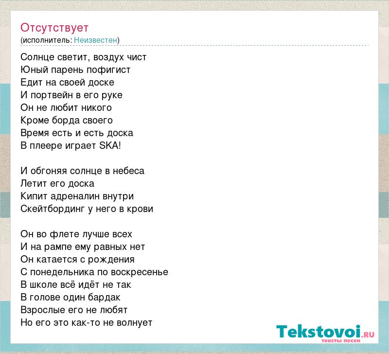 Солнце светит, воздух чист Юный парень пофигист Едит на своей доске И портвейн в его руке Он не любит никого Кроме борда своего Время есть и есть доска В плеере играет SKA! И обгоняя солнце в небеса Летит его доска Кипит адреналин внутри Скейтбординг у него в крови Он во флете лучше всех И на рампе ему равных нет Он катается с рождения С понедельника по воскресенье В школе всё идёт не так В голове один бардак Взрослые его не любят Но его это как-то не волнует