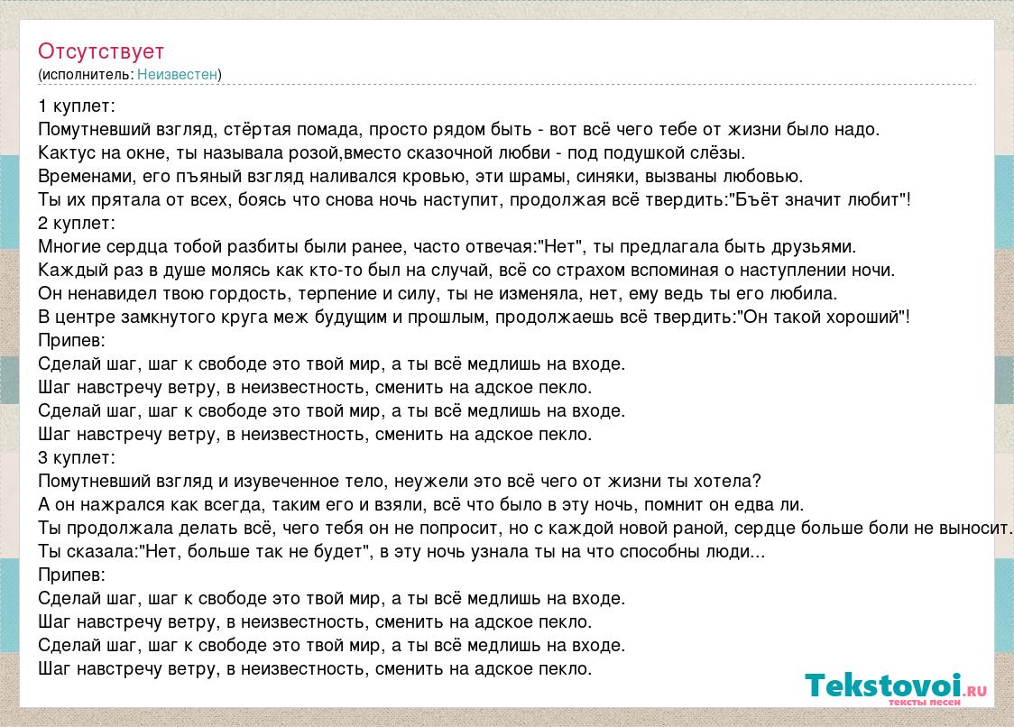1 куплет: Помутневший взгляд, стёртая помада, просто рядом быть - вот всё чего тебе от жизни было надо. Кактус на окне, ты называла розой,вместо сказочной любви - под подушкой слёзы. Временами, его пъяный взгляд наливался кровью, эти шрамы, синяки, вызваны любовью. Ты их прятала от всех, боясь что снова ночь наступит, продолжая всё твердить:"Бъёт значит любит"! 2 куплет: Многие сердца тобой разбиты были ранее, часто отвечая:"Нет", ты предлагала быть друзьями. Каждый раз в душе молясь как кто-то был на случай, всё со страхом вспоминая о наступлении ночи. Он ненавидел твою гордость, терпение и силу, ты не изменяла, нет, ему ведь ты его любила. В центре замкнутого круга меж будущим и прошлым, продолжаешь всё твердить:"Он такой хороший"! Припев: Сделай шаг, шаг к свободе это твой мир, а ты всё медлишь на входе. Шаг навстречу ветру, в неизвестность, сменить на адское пекло. Сделай шаг, шаг к свободе это твой мир, а ты всё медлишь на входе. Шаг навстречу ветру, в неизвестность, сменить на адское пекло. 3 куплет: Помутневший взгляд и изувеченное тело, неужели это всё чего от жизни ты хотела? А он нажрался как всегда, таким его и взяли, всё что было в эту ночь, помнит он едва ли. Ты продолжала делать всё, чего тебя он не попросит, но с каждой новой раной, сердце больше боли не выносит. Ты сказала:"Нет, больше так не будет", в эту ночь узнала ты на что способны люди... Припев: Сделай шаг, шаг к свободе это твой мир, а ты всё медлишь на входе. Шаг навстречу ветру, в неизвестность, сменить на адское пекло. Сделай шаг, шаг к свободе это твой мир, а ты всё медлишь на входе. Шаг навстречу ветру, в неизвестность, сменить на адское пекло.
