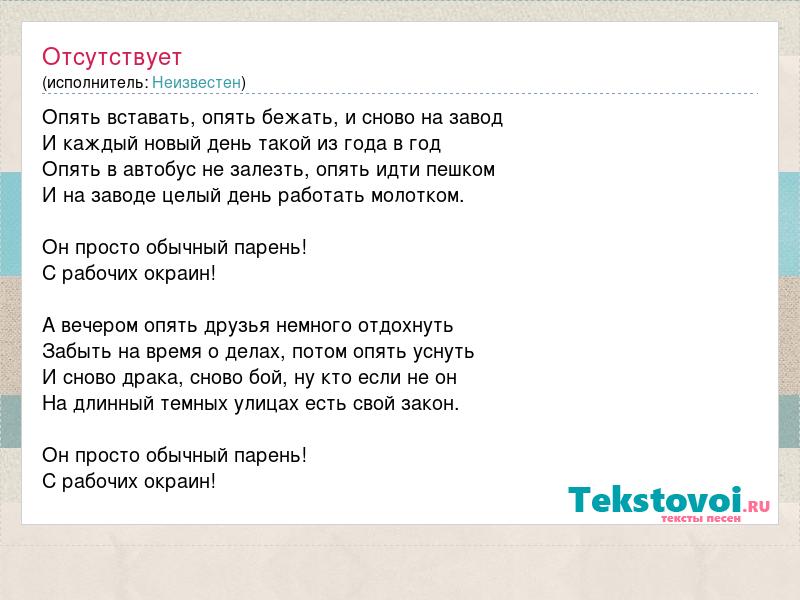 Опять вставать, опять бежать, и сново на завод И каждый новый день такой из года в год Опять в автобус не залезть, опять идти пешком И на заводе целый день работать молотком. Он просто обычный парень! С рабочих окраин! А вечером опять друзья немного отдохнуть Забыть на время о делах, потом опять уснуть И сново драка, сново бой, ну кто если не он На длинный темных улицах есть свой закон. Он просто обычный парень! С рабочих окраин!