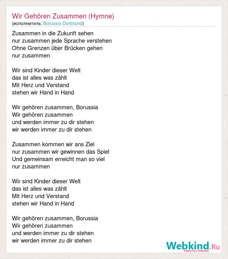 Zusammen in die Zukunft sehen nur zusammen jede Sprache verstehen Ohne Grenzen über Brücken gehen nur zusammen Wir sind Kinder dieser Welt das ist alles was zählt Mit Herz und Verstand stehen wir Hand in Hand Wir gehören zusammen, [bad word] Wir gehören zusammen und werden immer zu dir stehen wir werden immer zu dir stehen Zusammen kommen wir ans Ziel nur zusammen wir gewinnen das Spiel Und gemeinsam erreicht man so viel nur zusammen Wir sind Kinder dieser Welt das ist alles was zählt Mit Herz und Verstand stehen wir Hand in Hand Wir gehören zusammen, [bad word] Wir gehören zusammen und werden immer zu dir stehen wir werden immer zu dir stehen