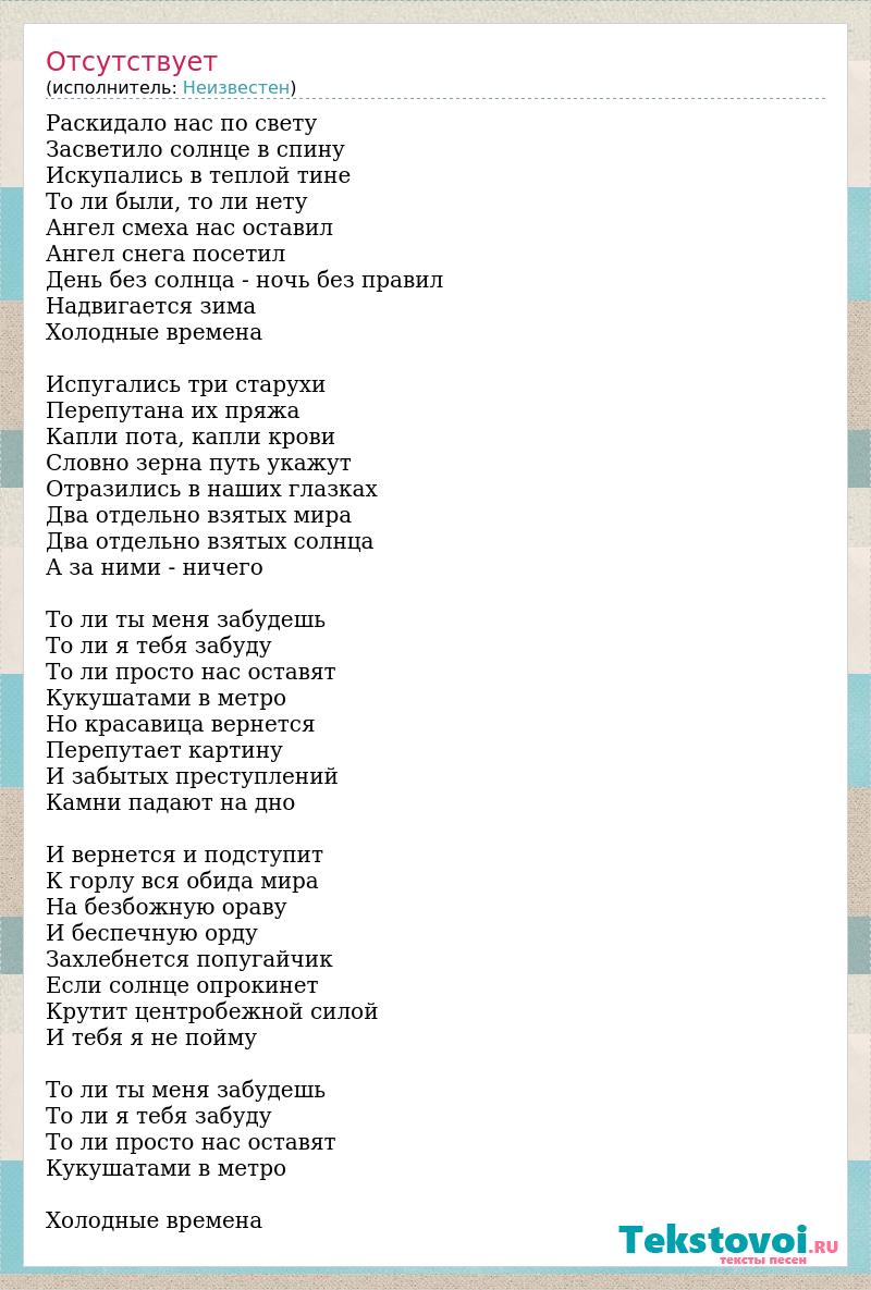Раскидало нас по свету Засветило солнце в спину Искупались в теплой тине То ли были, то ли нету Ангел смеха нас оставил Ангел снега посетил День без солнца - ночь без правил Надвигается зима Холодные времена Испугались три старухи Перепутана их пряжа Капли пота, капли крови Словно зерна путь укажут Отразились в наших глазках Два отдельно взятых мира Два отдельно взятых солнца А за ними - ничего То ли ты меня забудешь То ли я тебя забуду То ли просто нас оставят Кукушатами в метро Но красавица вернется Перепутает картину И забытых преступлений Камни падают на дно И вернется и подступит К горлу вся обида мира На безбожную ораву И беспечную орду Захлебнется попугайчик Если солнце опрокинет Крутит центробежной силой И тебя я не пойму То ли ты меня забудешь То ли я тебя забуду То ли просто нас оставят Кукушатами в метро Холодные времена
