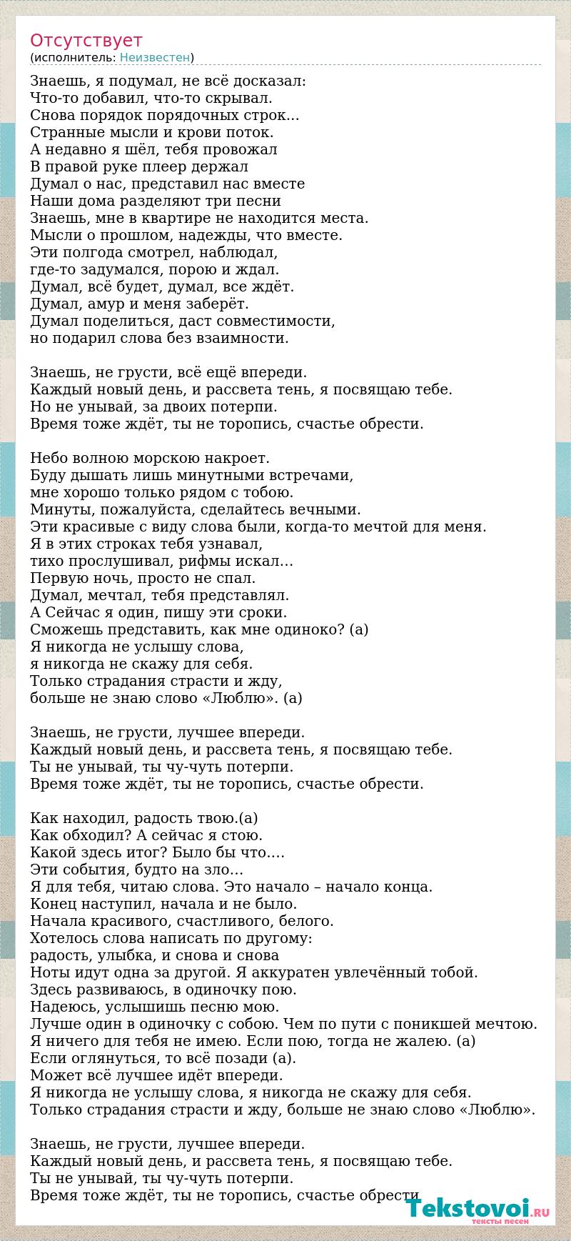 Знаешь, я подумал, не всё досказал: Что-то добавил, что-то скрывал. Снова порядок порядочных строк... Странные мысли и крови поток. А недавно я шёл, тебя провожал В правой руке плеер держал Думал о нас, представил нас вместе Наши дома разделяют три песни Знаешь, мне в квартире не находится места. Мысли о прошлом, надежды, что вместе. Эти полгода смотрел, наблюдал, где-то задумался, порою и ждал. Думал, всё будет, думал, все ждёт. Думал, амур и меня заберёт. Думал поделиться, даст совместимости, но подарил слова без взаимности. Знаешь, не грусти, всё ещё впереди. Каждый новый день, и рассвета тень, я посвящаю тебе. Но не унывай, за двоих потерпи. Время тоже ждёт, ты не торопись, счастье обрести. Небо волною морскою накроет. Буду дышать лишь минутными встречами, мне хорошо только рядом с тобою. Минуты, пожалуйста, сделайтесь вечными. Эти красивые с виду слова были, когда-то мечтой для меня. Я в этих строках тебя узнавал, тихо прослушивал, рифмы искал… Первую ночь, просто не спал. Думал, мечтал, тебя представлял. А Сейчас я один, пишу эти сроки. Сможешь представить, как мне одиноко? (а) Я никогда не услышу слова, я никогда не скажу для себя. Только страдания страсти и жду, больше не знаю слово «Люблю». (а) Знаешь, не грусти, лучшее впереди. Каждый новый день, и рассвета тень, я посвящаю тебе. Ты не унывай, ты чу-чуть потерпи. Время тоже ждёт, ты не торопись, счастье обрести. Как находил, радость твою.(а) Как обходил? А сейчас я стою. Какой здесь итог? Было бы что.… Эти события, будто на зло… Я для тебя, читаю слова. Это начало – начало конца. Конец наступил, начала и не было. Начала красивого, счастливого, белого. Хотелось слова написать по другому: радость, улыбка, и снова и снова Ноты идут одна за другой. Я аккуратен увлечённый тобой. Здесь развиваюсь, в одиночку пою. Надеюсь, услышишь песню мою. Лучше один в одиночку с собою. Чем по пути с поникшей мечтою. Я ничего для тебя не имею. Если пою, тогда не жалею. (а) Если оглянуться, то всё позади (а). Может всё лучшее идёт впереди. Я никогда не услышу слова, я никогда не скажу для себя. Только страдания страсти и жду, больше не знаю слово «Люблю». Знаешь, не грусти, лучшее впереди. Каждый новый день, и рассвета тень, я посвящаю тебе. Ты не унывай, ты чу-чуть потерпи. Время тоже ждёт, ты не торопись, счастье обрести