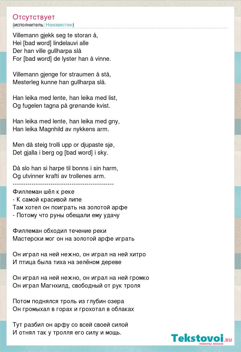 Villemann gjekk seg te storan å, Hei [bad word] lindelauvi alle Der han ville gullharpa slå For [bad word] de lyster han å vinne. Villemann gjenge for straumen å stå, Mesterleg kunne han gullharpa slå. Han leika med lente, han leika med list, Og fugelen tagna på grønande kvist. Han leika med lente, han leika med gny, Han leika Magnhild av nykkens arm. Men då steig trolli upp or djupaste sjø, Det gjalla i berg og [bad word] i sky. Då slo han si harpe til bonns i sin harm, Og utvinner krafti av trollenes arm. ------------------------------------------------ Филлеман шёл к реке - К самой красивой липе Там хотел он поиграть на золотой арфе - Потому что руны обещали ему удачу Филлеман обходил течение реки Мастерски мог он на золотой арфе играть Он играл на ней нежно, он играл на ней хитро И птица была тиха на зелёном дереве Он играл на ней нежно, он играл на ней громко Он играл Магнхилд, свободный от рук троля Потом поднялся троль из глубин озера Он громыхал в горах и грохотал в облаках Тут разбил он арфу со всей своей силой И отнял так у тролля его силу и мощь.