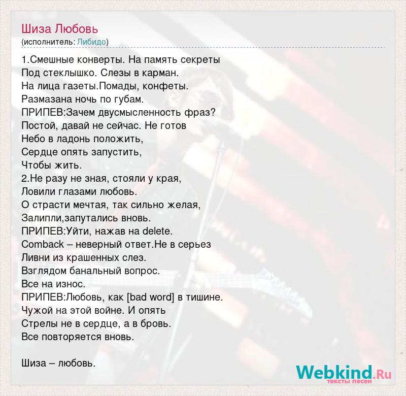1.Смешные конверты. На память секреты Под стеклышко. Слезы в карман. На лица газеты.Помады, конфеты. Размазана ночь по губам. ПРИПЕВ:Зачем двусмысленность фраз? Постой, давай не сейчас. Не готов Небо в ладонь положить, Сердце опять запустить, Чтобы жить. 2.Не разу не зная, стояли у края, Ловили глазами любовь. О страсти мечтая, так сильно желая, Залипли,запутались вновь. ПРИПЕВ:Уйти, нажав на delete. [bad word] – неверный ответ.Не в серьез Ливни из крашенных слез. Взглядом банальный вопрос. Все на износ. ПРИПЕВ:Любовь, как [bad word] в тишине. Чужой на этой войне. И опять Стрелы не в сердце, а в бровь. Все повторяется вновь. Шиза – любовь.