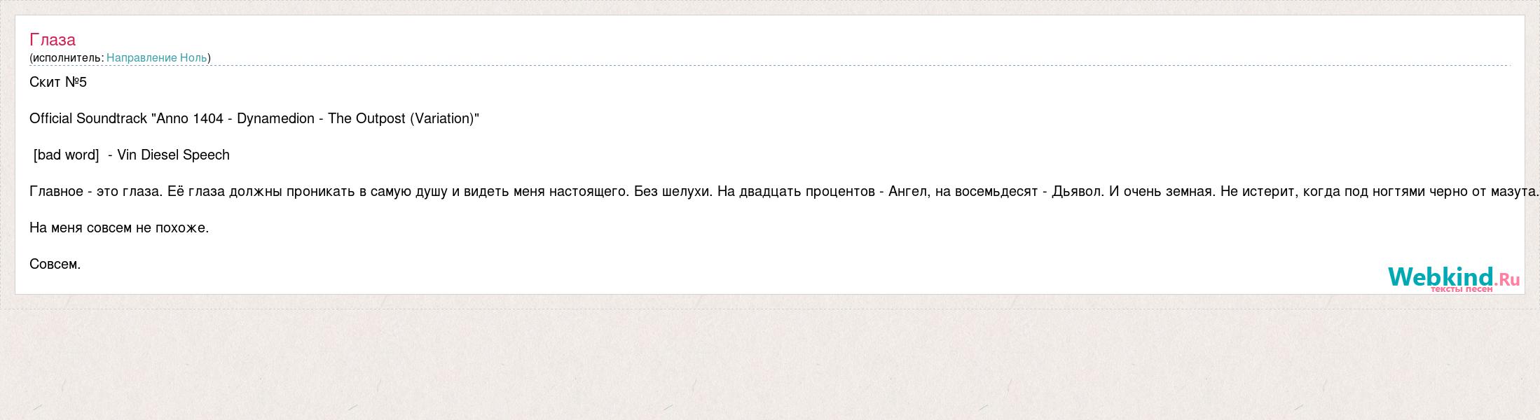 Скит №5 Official Soundtrack "Anno 1404 - Dynamedion - The Outpost (Variation)" [bad word] - Vin Diesel Speech Главное - это глаза. Её глаза должны проникать в самую душу и видеть меня настоящего. Без шелухи. На двадцать процентов - Ангел, на восемьдесят - Дьявол. И очень земная. Не истерит, когда под ногтями черно от мазута. На меня совсем не похоже. Совсем.