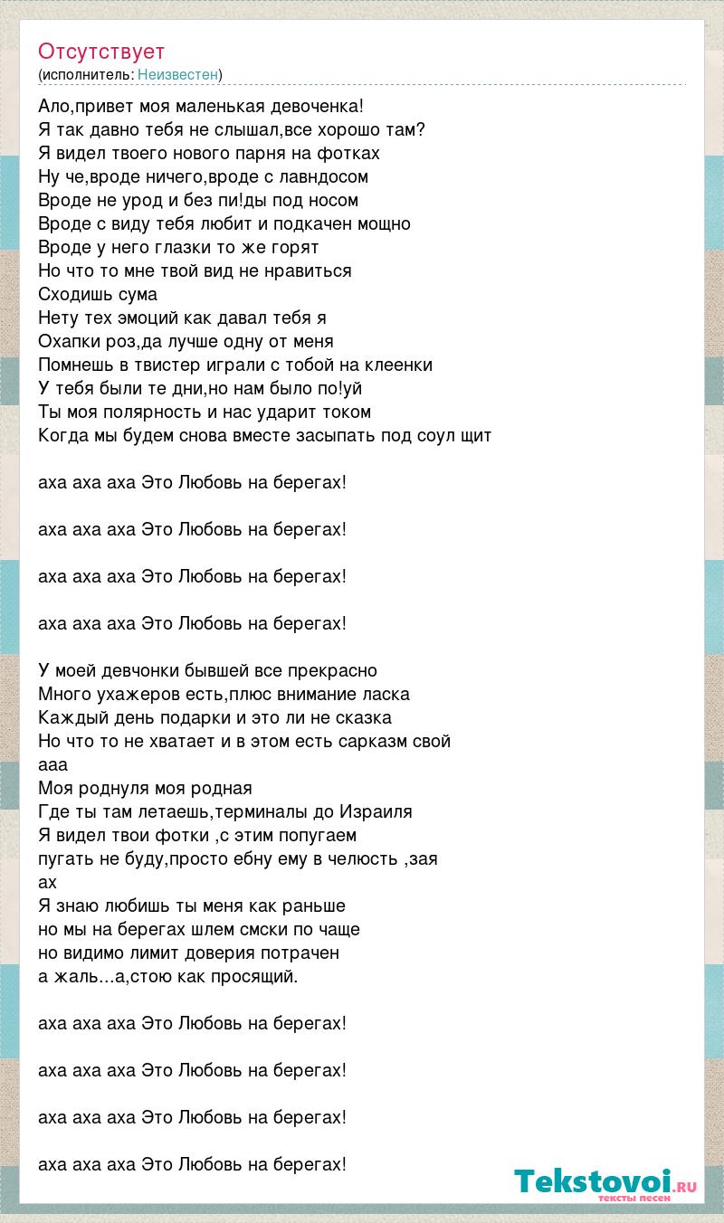 Ало,привет моя маленькая девоченка! Я так давно тебя не слышал,все хорошо там? Я видел твоего нового парня на фотках Ну че,вроде ничего,вроде с лавндосом Вроде не урод и без пи!ды под носом Вроде с виду тебя любит и подкачен мощно Вроде у него глазки то же горят Но что то мне твой вид не нравиться Сходишь сума Нету тех эмоций как давал тебя я Охапки роз,да лучше одну от меня Помнешь в твистер играли с тобой на клеенки У тебя были те дни,но нам было по!уй Ты моя полярность и нас ударит током Когда мы будем снова вместе засыпать под соул щит аха аха аха Это Любовь на берегах! аха аха аха Это Любовь на берегах! аха аха аха Это Любовь на берегах! аха аха аха Это Любовь на берегах! У моей девчонки бывшей все прекрасно Много ухажеров есть,плюс внимание ласка Каждый день подарки и это ли не сказка Но что то не хватает и в этом есть сарказм свой ааа Моя роднуля моя родная Где ты там летаешь,терминалы до Израиля Я видел твои фотки ,с этим попугаем пугать не буду,просто ебну ему в челюсть ,зая ах Я знаю любишь ты меня как раньше но мы на берегах шлем смски по чаще но видимо лимит доверия потрачен а жаль...а,стою как просящий. аха аха аха Это Любовь на берегах! аха аха аха Это Любовь на берегах! аха аха аха Это Любовь на берегах! аха аха аха Это Любовь на берегах!