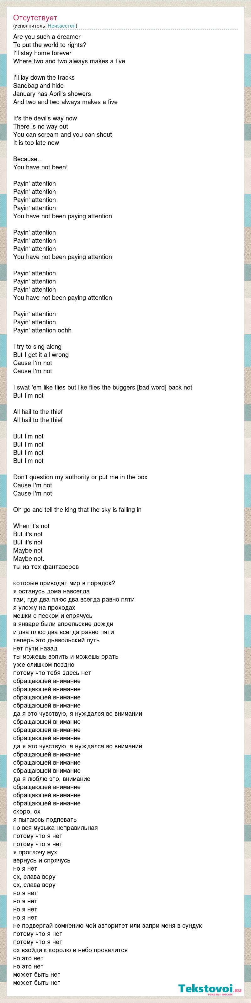 Are you such a dreamer To put the world to rights? I'll stay home forever Where two and two always makes a five I'll lay down the tracks Sandbag and hide January has April's showers And two and two always makes a five It's the devil's way now There is no way out You can scream and you can shout It is too late now Because... You have not been! Payin' attention Payin' attention Payin' attention Payin' attention You have not been paying attention Payin' attention Payin' attention Payin' attention You have not been paying attention Payin' attention Payin' attention Payin' attention You have not been paying attention Payin' attention Payin' attention Payin' attention oohh I try to sing along But I get it all wrong Cause I'm not Cause I'm not I swat 'em like flies but like flies the buggers [bad word] back not But I’m not All hail to the thief All hail to the thief But I'm not But I'm not But I'm not But I'm not Don't question my authority or put me in the box Cause I'm not Cause I'm not Oh go and tell the king that the sky is falling in When it's not But it's not But it's not Maybe not Maybe not. ты из тех фантазеров которые приводят мир в порядок? я останусь дома навсегда там, где два плюс два всегда равно пяти я уложу на проходах мешки с песком и спрячусь в январе были апрельские дожди и два плюс два всегда равно пяти теперь это дьявольский путь нет пути назад ты можешь вопить и можешь орать уже слишком поздно потому что тебя здесь нет обращающей внимание обращающей внимание обращающей внимание обращающей внимание да я это чувствую, я нуждался во внимании обращающей внимание обращающей внимание обращающей внимание да я это чувствую, я нуждался во внимании обращающей внимание обращающей внимание обращающей внимание да я люблю это, внимание обращающей внимание обращающей внимание обращающей внимание скоро, ох я пытаюсь подпевать но вся музыка неправильная потому что я нет потому что я нет я проглочу мух вернусь и спрячусь но я нет ох, слава вору ох, слава вору но я нет но я нет но я нет но я нет не подвергай сомнению мой авторитет или запри меня в сундук потому что я нет потому что я нет ох взойди к королю и небо провалится но это нет но это нет может быть нет может быть нет