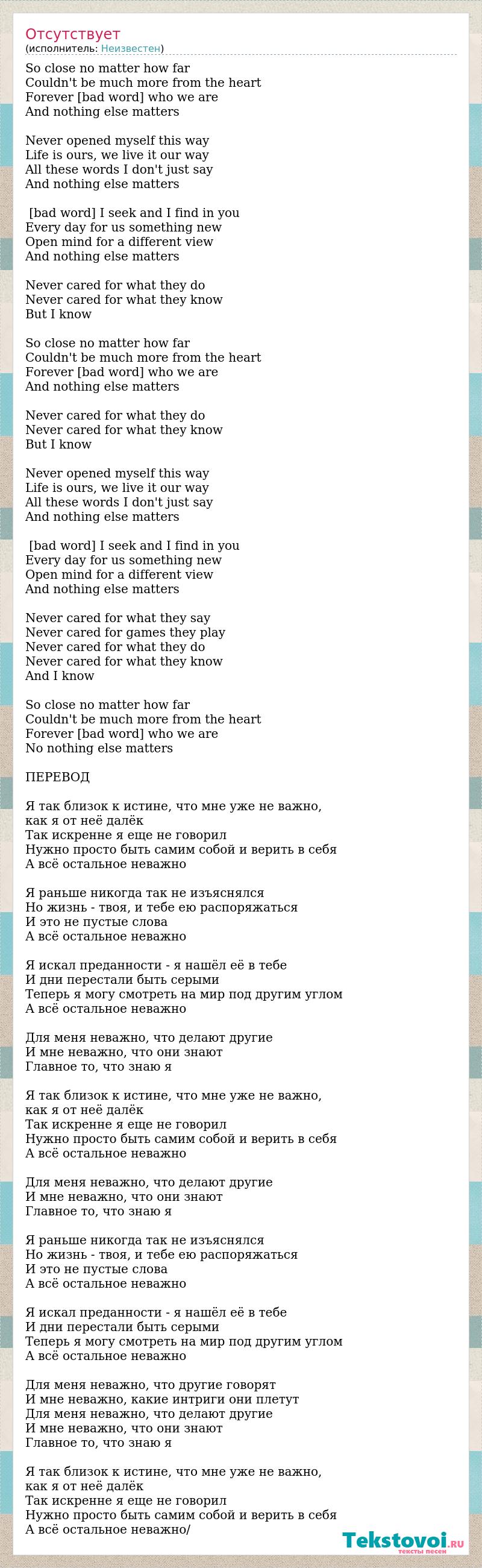 So close no matter how far Couldn't be much more from the heart Forever [bad word] who we are And nothing else matters Never opened myself this way Life is ours, we live it our way All these words I don't just say And nothing else matters [bad word] I seek and I find in you Every day for us something new Open mind for a different view And nothing else matters Never cared for what they do Never cared for what they know But I know So close no matter how far Couldn't be much more from the heart Forever [bad word] who we are And nothing else matters Never cared for what they do Never cared for what they know But I know Never opened myself this way Life is ours, we live it our way All these words I don't just say And nothing else matters [bad word] I seek and I find in you Every day for us something new Open mind for a different view And nothing else matters Never cared for what they say Never cared for games they play Never cared for what they do Never cared for what they know And I know So close no matter how far Couldn't be much more from the heart Forever [bad word] who we are No nothing else matters ПЕРЕВОД Я так близок к истине, что мне уже не важно, как я от неё далёк Так искренне я еще не говорил Нужно просто быть самим собой и верить в себя А всё остальное неважно Я раньше никогда так не изъяснялся Но жизнь - твоя, и тебе ею распоряжаться И это не пустые слова А всё остальное неважно Я искал преданности - я нашёл её в тебе И дни перестали быть серыми Теперь я могу смотреть на мир под другим углом А всё остальное неважно Для меня неважно, что делают другие И мне неважно, что они знают Главное то, что знаю я Я так близок к истине, что мне уже не важно, как я от неё далёк Так искренне я еще не говорил Нужно просто быть самим собой и верить в себя А всё остальное неважно Для меня неважно, что делают другие И мне неважно, что они знают Главное то, что знаю я Я раньше никогда так не изъяснялся Но жизнь - твоя, и тебе ею распоряжаться И это не пустые слова А всё остальное неважно Я искал преданности - я нашёл её в тебе И дни перестали быть серыми Теперь я могу смотреть на мир под другим углом А всё остальное неважно Для меня неважно, что другие говорят И мне неважно, какие интриги они плетут Для меня неважно, что делают другие И мне неважно, что они знают Главное то, что знаю я Я так близок к истине, что мне уже не важно, как я от неё далёк Так искренне я еще не говорил Нужно просто быть самим собой и верить в себя А всё остальное неважно/