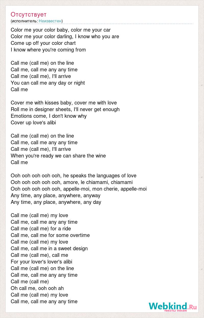 Color me your color baby, color me your car Color me your color darling, I know who you are [bad word] up off your color chart I know where [bad word] from Call me (call me) on the line Call me, call me any any time Call me (call me), I'll arrive You can call me any day or night Call me Cover me with kisses baby, cover me with love Roll me in designer sheets, I'll never get enough [bad word] I don't know why Cover up love's alibi Call me (call me) on the line Call me, call me any any time Call me (call me), I'll arrive When you're ready we can share the wine Call me Ooh ooh ooh ooh ooh, he speaks the languages of love Ooh ooh ooh ooh ooh, amore, le chiamami, chiamami Ooh ooh ooh ooh ooh, appelle-moi, mon cherie, appelle-moi Any time, any place, anywhere, anyway Any time, any place, anywhere, any day Call me (call me) my love Call me, call me any any time Call me (call me) for a ride Call me, call me for some overtime Call me (call me) my love Call me, call me in a sweet design Call me (call me), call me For your lover's lover's alibi Call me (call me) on the line Call me, call me any any time Call me (call me) Oh call me, ooh ooh ah Call me (call me) my love Call me, call me any any time