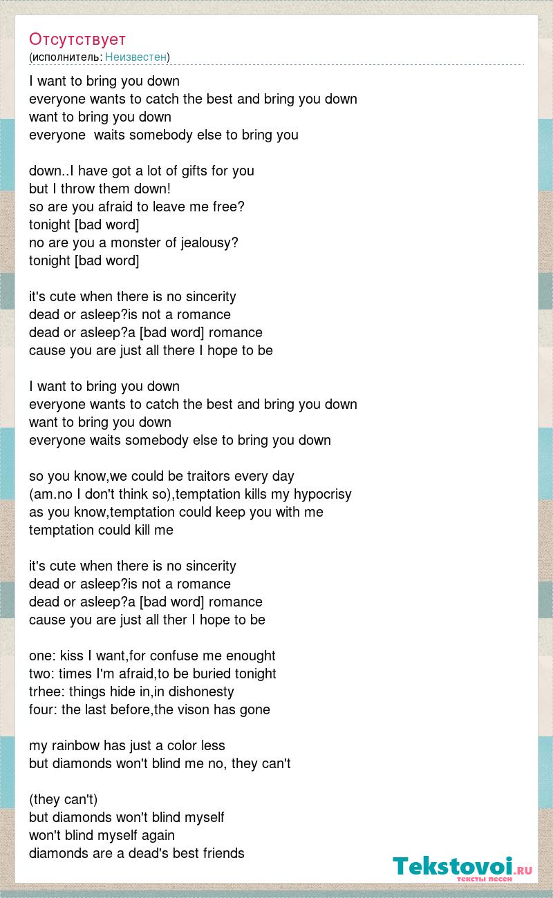 I want to bring you down everyone wants to catch the best and bring you down want to bring you down everyone waits somebody else to bring you down..I have got a lot of gifts for you but I throw them down! so are you afraid to leave me free? tonight [bad word] no are you a monster of jealousy? tonight [bad word] it's cute when there is no sincerity dead or asleep?is not a romance dead or asleep?a [bad word] romance cause you are just all there I hope to be I want to bring you down everyone wants to catch the best and bring you down want to bring you down everyone waits somebody else to bring you down so you know,we could be traitors every day (am.no I don't think so),temptation kills my hypocrisy as you know,temptation could keep you with me temptation could kill me it's cute when there is no sincerity dead or asleep?is not a romance dead or asleep?a [bad word] romance cause you are just all ther I hope to be one: kiss I want,for confuse me enought two: times I'm afraid,to be buried tonight trhee: things hide in,in dishonesty four: the last before,the vison has gone my rainbow has just a color less but diamonds won't blind me no, they can't (they can't) but diamonds won't blind myself won't blind myself again diamonds are a dead's best friends