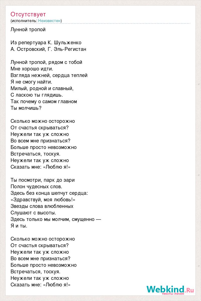 Лунной тропой Из репертуара К. Шульженко А. Островский, Г. Эль-Регистан Лунной тропой, рядом с тобой Мне хорошо идти. Взгляда нежней, сердца теплей Я не смогу найти. Милый, родной и славный, С ласкою ты глядишь. Так почему о самом главном Ты молчишь? Сколько можно осторожно От счастья скрываться? Неужели так уж сложно Во всем мне признаться? Больше просто невозможно Встречаться, тоскуя. Неужели так уж сложно Сказать мне: «Люблю я!» Ты посмотри, парк до зари Полон чудесных слов. Здесь без конца шепчут сердца: «Здравствуй, моя любовь!» Звезды слова влюбленных Слушают с высоты. Здесь только мы молчим, смущенно — Я и ты. Сколько можно осторожно От счастья скрываться? Неужели так уж сложно Во всем мне признаться? Больше просто невозможно Встречаться, тоскуя. Неужели так уж сложно Сказать мне: «Люблю я!»