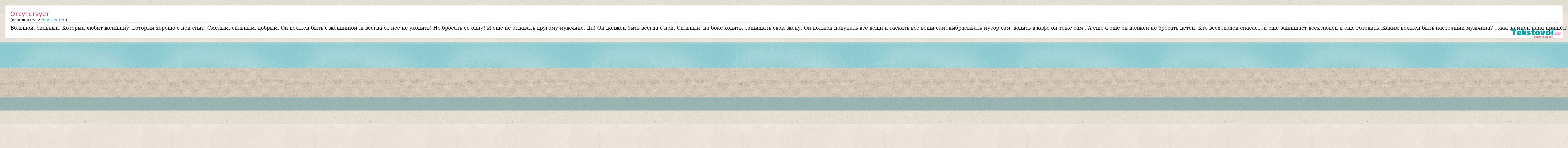 Большой, сильный. Который любит женщину, который хорошо с ней спит. Смелым, сильным, добрым. Он должен быть с женщиной..и всегда от нее не уходить! Не бросать ее одну! И еще не отдавать другому мужчине. Да! Он должен быть всегда с ней. Сильный, на бокс ходить, защищать свою жену. Он должен покупать все вещи и таскать все вещи сам..выбрасывать мусор сам, водить в кафе он тоже сам...А еще а еще он должен не бросать детей. Кто всех людей спасает, и еще защищает всех людей и еще готовить..Каким должен быть настоящий мужчина? ...ааа за мной папа пришел!