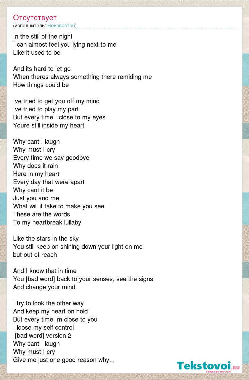 In the still of the night I can almost feel you lying next to me Like it used to be And its hard to let go When theres always something there remiding me How things could be Ive tried to get you off my mind Ive tried to play my part But every time I close to my eyes Youre still inside my heart Why cant I laugh Why must I cry Every time we say goodbye Why does it rain Here in my heart Every day that were apart Why cant it be Just you and me What will it take to make you see These are the words To my heartbreak lullaby Like the stars in the sky You still keep on shining down your light on me but out of reach And I know that in time You [bad word] back to your senses, see the signs And change your mind I try to look the other way And keep my heart on hold But every time Im close to you I loose my self control [bad word] version 2 Why cant I laugh Why must I cry Give me just one good reason why...