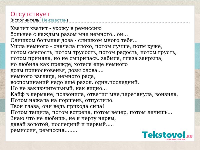 Хватит хватит - ухожу в ремиссию больнее с каждым разом мне немного.. он... Слишком большая доза - слишком много тебя... Ушла немного - сначала плохо, потом лучше, потм хуже, потом смелость, потом трусость, потом радость, потом грусть, потом приняла, но не смирилась. забыла, глаза закрыла, но любила как прежде, хотела ещё немного дозы прикосновенья, дозы слова.... немного взгляда, немного рада, воспоминаний надо ещё разок. один.последний. Но не заключительный, как видно... Кайф в кермане, позвонила, ответил мне,перетянула, вонзила, Потом нажала на поршень, отпустило. Твои глаза, они ведь прихода сила! Потом тащила, потом встреча, потом вечер, потом лечишь... Знаю что не любишь, не к черту нервы, давай золотой, последний и первый..... ремиссия, ремиссия........