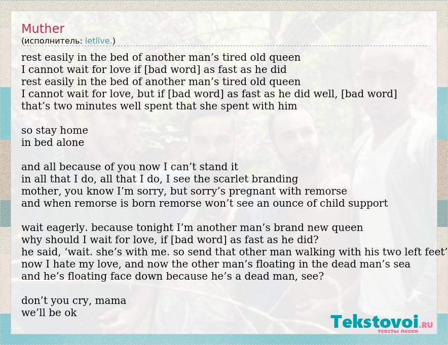 rest easily in the bed of another man’s tired old queen I cannot wait for love if [bad word] as fast as he did rest easily in the bed of another man’s tired old queen I cannot wait for love, but if [bad word] as fast as he did well, [bad word] that’s two minutes well spent that she spent with him so stay home in bed alone and all because of you now I can’t stand it in all that I do, all that I do, I see the scarlet branding mother, you know I’m sorry, but sorry’s pregnant with remorse and when remorse is born remorse won’t see an ounce of child support wait eagerly. because tonight I’m another man’s brand new queen why should I wait for love, if [bad word] as fast as he did? he said, ‘wait. she’s with me. so send that other man walking with his two left feet’ now I hate my love, and now the other man’s floating in the dead man’s sea and he’s floating face down because he’s a dead man, see? don’t you cry, mama we’ll be ok
