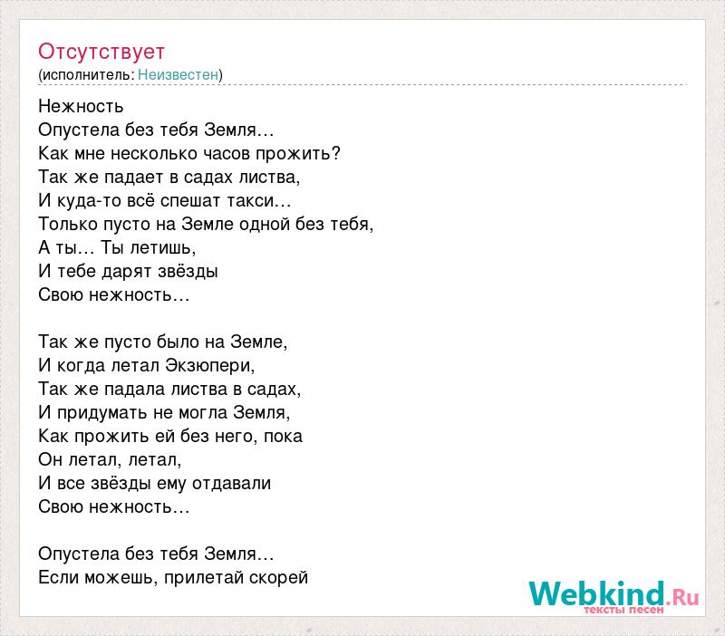 Нежность Опустела без тебя Земля… Как мне несколько часов прожить? Так же падает в садах листва, И куда-то всё спешат такси… Только пусто на Земле одной без тебя, А ты… Ты летишь, И тебе дарят звёзды Свою нежность… Так же пусто было на Земле, И когда летал Экзюпери, Так же падала листва в садах, И придумать не могла Земля, Как прожить ей без него, пока Он летал, летал, И все звёзды ему отдавали Свою нежность… Опустела без тебя Земля… Если можешь, прилетай скорей