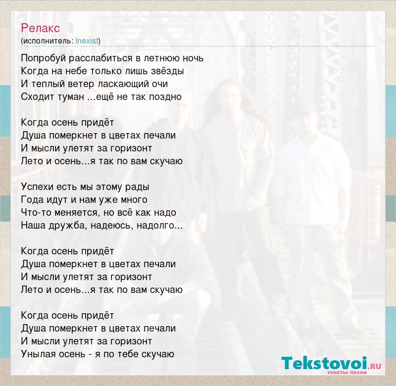 Попробуй расслабиться в летнюю ночь Когда на небе только лишь звёзды И теплый ветер ласкающий очи Сходит туман ...ещё не так поздно Когда осень придёт Душа померкнет в цветах печали И мысли улетят за горизонт Лето и осень...я так по вам скучаю Успехи есть мы этому рады Года идут и нам уже много Что-то меняется, но всё как надо Наша дружба, надеюсь, надолго... Когда осень придёт Душа померкнет в цветах печали И мысли улетят за горизонт Лето и осень...я так по вам скучаю Когда осень придёт Душа померкнет в цветах печали И мысли улетят за горизонт Унылая осень - я по тебе скучаю