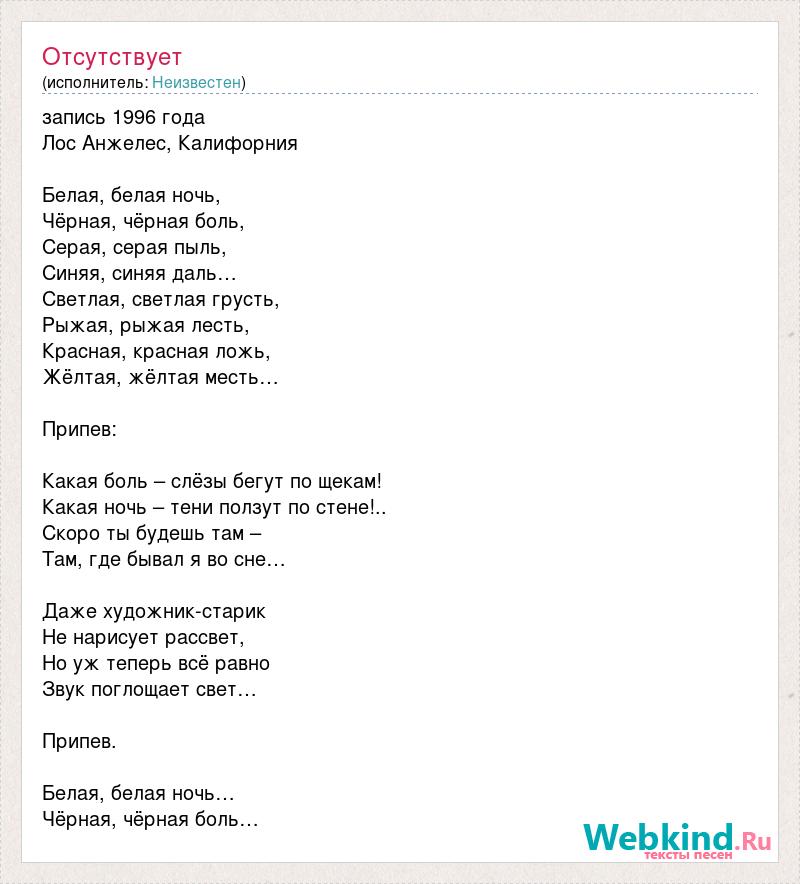 запись 1996 года Лос Анжелес, Калифорния Белая, белая ночь, Чёрная, чёрная боль, Серая, серая пыль, Синяя, синяя даль… Светлая, светлая грусть, Рыжая, рыжая лесть, Красная, красная ложь, Жёлтая, жёлтая месть… Припев: Какая боль – слёзы бегут по щекам! Какая ночь – тени ползут по стене!.. Скоро ты будешь там – Там, где бывал я во сне… Даже художник-старик Не нарисует рассвет, Но уж теперь всё равно Звук поглощает свет… Припев. Белая, белая ночь… Чёрная, чёрная боль…