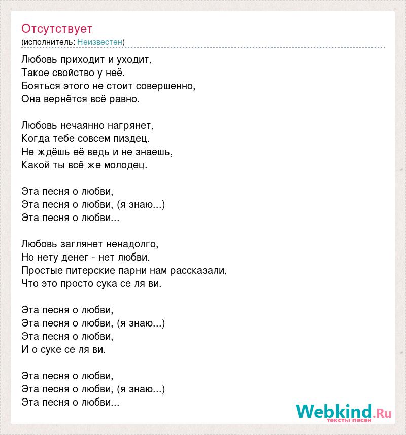 Любовь приходит и уходит, Такое свойство у неё. Бояться этого не стоит совершенно, Она вернётся всё равно. Любовь нечаянно нагрянет, Когда тебе совсем пиздец. Не ждёшь её ведь и не знаешь, Какой ты всё же молодец. Эта песня о любви, Эта песня о любви, (я знаю...) Эта песня о любви... Любовь заглянет ненадолго, Но нету денег - нет любви. Простые питерские парни нам рассказали, Что это просто сука се ля ви. Эта песня о любви, Эта песня о любви, (я знаю...) Эта песня о любви, И о суке се ля ви. Эта песня о любви, Эта песня о любви, (я знаю...) Эта песня о любви...