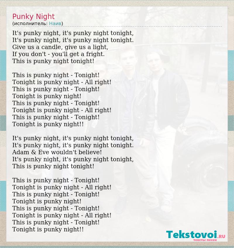 It's punky night, it's punky night tonight, It's punky night, it's punky night tonight. Give us a candle, give us a light, If you don't - you'll get a fright. This is punky night tonight! This is punky night - Tonight! Tonight is punky night - All right! This is punky night - Tonight! Tonight is punky night! This is punky night - Tonight! Tonight is punky night - All right! This is punky night - Tonight! Tonight is punky night!! It's punky night, it's punky night tonight, It's punky night, it's punky night tonight. Adam & Eve wouldn't believe! It's punky night, it's punky night tonight, This is punky night tonight! This is punky night - Tonight! Tonight is punky night - All right! This is punky night - Tonight! Tonight is punky night! This is punky night - Tonight! Tonight is punky night - All right! This is punky night - Tonight! Tonight is punky night!!