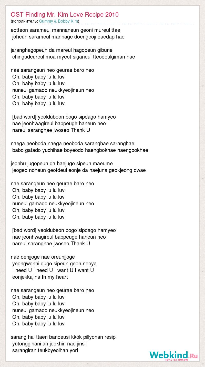 eotteon sarameul mannaneun geoni mureul ttae joheun sarameul mannage doengeoji daedap hae jaranghagopeun da mareul hagopeun gibune chingudeureul moa myeot siganeul tteodeulgiman hae nae sarangeun neo geurae baro neo Oh, baby baby lu lu luv Oh, baby baby lu lu luv nuneul gamado neukkyeojineun neo Oh, baby baby lu lu luv Oh, baby baby lu lu luv [bad word] yeoldubeon bogo sipdago hamyeo nae jeonhwagireul bappeuge haneun neo nareul saranghae jwoseo Thank U naega neoboda naega neoboda saranghae saranghae babo gatado yuchihae boyeodo haengbokhae haengbokhae jeonbu jugopeun da haejugo sipeun maeume jeogeo noheun geotdeul eonje da haejuna geokjeong dwae nae sarangeun neo geurae baro neo Oh, baby baby lu lu luv Oh, baby baby lu lu luv nuneul gamado neukkyeojineun neo Oh, baby baby lu lu luv Oh, baby baby lu lu luv [bad word] yeoldubeon bogo sipdago hamyeo nae jeonhwagireul bappeuge haneun neo nareul saranghae jwoseo Thank U nae oenjjoge nae oreunjjoge yeongwonhi dugo sipeun geon neoya I need U I need U I want U I want U eonjekkajina In my heart nae sarangeun neo geurae baro neo Oh, baby baby lu lu luv Oh, baby baby lu lu luv nuneul gamado neukkyeojineun neo Oh, baby baby lu lu luv Oh, baby baby lu lu luv sarang hal ttaen bandeusi kkok pillyohan resipi yutonggihani an jeokhin nae jinsil sarangiran teukbyeolhan yori