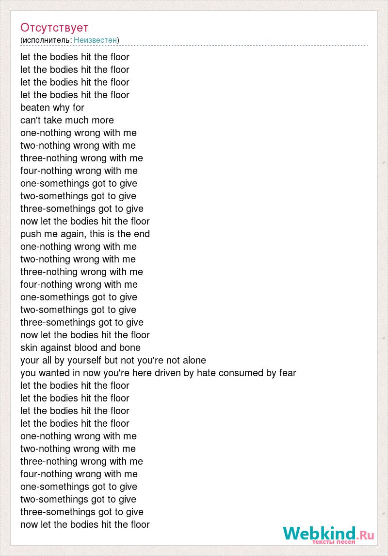 let the bodies hit the floor let the bodies hit the floor let the bodies hit the floor let the bodies hit the floor beaten why for can't take much more one-nothing wrong with me two-nothing wrong with me three-nothing wrong with me four-nothing wrong with me one-somethings got to give two-somethings got to give three-somethings got to give now let the bodies hit the floor push me again, this is the end one-nothing wrong with me two-nothing wrong with me three-nothing wrong with me four-nothing wrong with me one-somethings got to give two-somethings got to give three-somethings got to give now let the bodies hit the floor skin against blood and bone your all by yourself but not you're not alone you wanted in now you're here driven by hate consumed by fear let the bodies hit the floor let the bodies hit the floor let the bodies hit the floor let the bodies hit the floor one-nothing wrong with me two-nothing wrong with me three-nothing wrong with me four-nothing wrong with me one-somethings got to give two-somethings got to give three-somethings got to give now let the bodies hit the floor