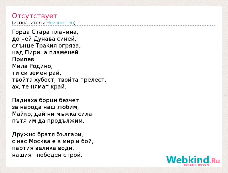 Горда Стара планина, до ней Дунава синей, слънце Тракия огрява, над Пирина пламеней. Припев: Мила Родино, ти си земен рай, твойта хубост, твойта прелест, ах, те нямат край. Паднаха борци безчет за народа наш любим, Майко, дай ни мъжка сила пътя им да продължим. Дружно братя българи, с нас Москва е в мир и бой, партия велика води, нашият победен строй.