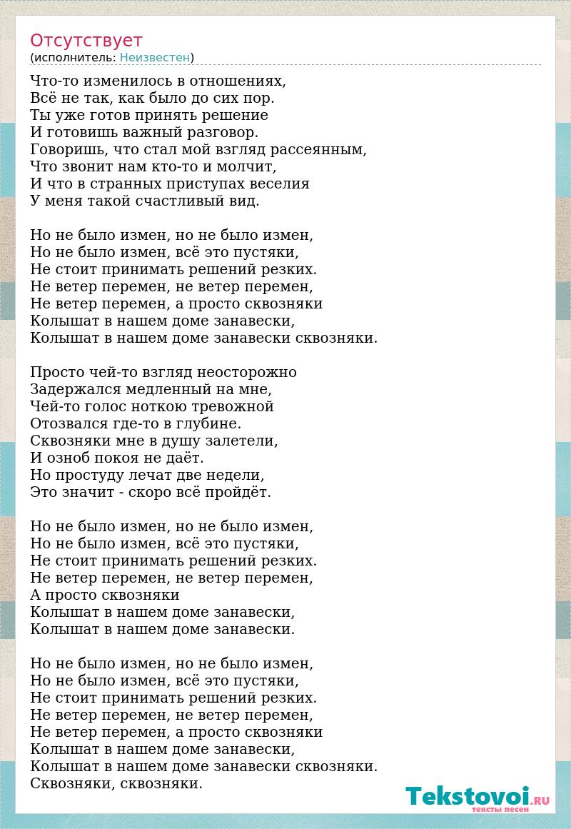 Что-то изменилось в отношениях, Всё не так, как было до сих пор. Ты уже готов принять решение И готовишь важный разговор. Говоришь, что стал мой взгляд рассеянным, Что звонит нам кто-то и молчит, И что в странных приступах веселия У меня такой счастливый вид. Но не было измен, но не было измен, Но не было измен, всё это пустяки, Не стоит принимать решений резких. Не ветер перемен, не ветер перемен, Не ветер перемен, а просто сквозняки Колышат в нашем доме занавески, Колышат в нашем доме занавески сквозняки. Просто чей-то взгляд неосторожно Задержался медленный на мне, Чей-то голос ноткою тревожной Отозвался где-то в глубине. Сквозняки мне в душу залетели, И озноб покоя не даёт. Но простуду лечат две недели, Это значит - скоро всё пройдёт. Но не было измен, но не было измен, Но не было измен, всё это пустяки, Не стоит принимать решений резких. Не ветер перемен, не ветер перемен, А просто сквозняки Колышат в нашем доме занавески, Колышат в нашем доме занавески. Но не было измен, но не было измен, Но не было измен, всё это пустяки, Не стоит принимать решений резких. Не ветер перемен, не ветер перемен, Не ветер перемен, а просто сквозняки Колышат в нашем доме занавески, Колышат в нашем доме занавески сквозняки. Сквозняки, сквозняки.