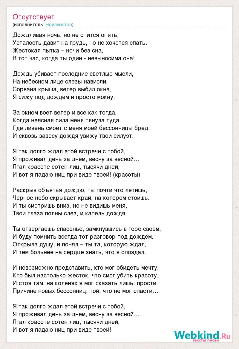 Дождливая ночь, но не спится опять, Усталость давит на грудь, но не хочется спать. Жестокая пытка – ночи без сна, В тот час, когда ты один - невыносима она! Дождь убивает последние светлые мысли, На небесном лице слезы нависли. Сорвана крыша, ветер выбил окна, Я сижу под дождем и просто мокну. За окном воет ветер и все как тогда, Когда неясная сила меня тянула туда. Где ливень смоет с меня моей бессонницы бред, И сквозь завесу дождя увижу твой силуэт. Я так долго ждал этой встречи с тобой, Я проживал день за днем, весну за весной… Лгал красоте сотен лиц, тысячи дней, И вот я падаю ниц при виде твоей! (красоты) Раскрыв объятья дождю, ты почти что летишь, Черное небо скрывает край, на котором стоишь. И ты смотришь вниз, но не видишь меня, Твои глаза полны слез, и капель дождя. Ты отвергаешь спасенье, замкнувшись в горе своем, И буду помнить всегда тот разговор под дождем. Открыла душу, и понял – ты та, которую ждал, И тем больнее на сердце знать, что я опоздал. И невозможно представить, кто мог обидеть мечту, Кто был настолько жесток, что смог убить красоту. И стоя там, на коленях я мог сказать лишь: прости Причине новых бессонниц, той, что не мог спасти… Я так долго ждал этой встречи с тобой, Я проживал день за днем, весну за весной… Лгал красоте сотен лиц, тысячи дней, И вот я падаю ниц при виде твоей!