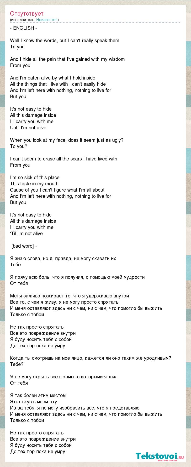 - ENGLISH - Well I know the words, but I can't really speak them To you And I hide all the pain that I've gained with my wisdom From you And I'm eaten alive by what I hold inside All the things that I live with I can't easily hide And I'm left here with nothing, nothing to live for But you It's not easy to hide All this damage inside I'll carry you with me Until I'm not alive When you look at my face, does it seem just as ugly? To you? I can't seem to erase all the scars I have lived with From you I'm so sick of this place This taste in my mouth Cause of you I can't figure what I'm all about And I'm left here with nothing, nothing to live for But you It's not easy to hide All this damage inside I'll carry you with me 'Til I'm not alive [bad word] - Я знаю слова, но я, правда, не могу сказать их Тебе Я прячу всю боль, что я получил, с помощью моей мудрости От тебя Меня заживо пожирает то, что я удерживаю внутри Все то, с чем я живу, я не могу просто спрятать И меня оставляют здесь ни с чем, ни с чем, что помогло бы выжить Только с тобой Не так просто спрятать Все это повреждение внутри Я буду носить тебя с собой До тех пор пока не умру Когда ты смотришь на мое лицо, кажется ли оно таким же уродливым? Тебе? Я не могу скрыть все шрамы, с которыми я жил От тебя Я так болен этим местом Этот вкус в моем рту Из-за тебя, я не могу изобразить все, что я представляю И меня оставляют здесь ни с чем, ни с чем, что помогло бы выжить Только с тобой Не так просто спрятать Все это повреждение внутри Я буду носить тебя с собой До тех пор пока не умру