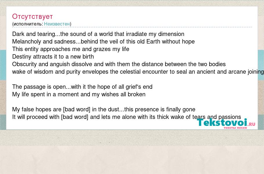 Dark and tearing...the sound of a world that irradiate my dimension Melancholy and sadness...behind the veil of this old Earth without hope This entity approaches me and grazes my life Destiny attracts it to a new birth Obscurity and anguish dissolve and with them the distance between the two bodies wake of wisdom and purity envelopes the celestial encounter to seal an ancient and arcane joining The passage is open...with it the hope of all grief's end My life spent in a moment and my wishes all broken My false hopes are [bad word] in the dust...this presence is finally gone It will proceed with [bad word] and lets me alone with its thick wake of tears and passions