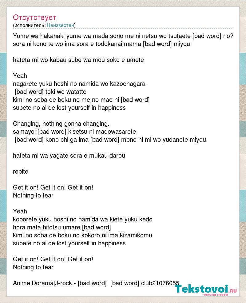 Yume wa hakanaki yume wa mada sono me ni netsu wo tsutaete [bad word] no? sora ni kono te wo ima sora e todokanai mama [bad word] miyou hateta mi wo kabau sube wa mou soko e umete Yeah nagarete yuku hoshi no namida wo kazoenagara [bad word] toki wo watatte kimi no soba de boku no me no mae ni [bad word] subete no ai de lost yourself in happiness Changing, nothing gonna changing. samayoi [bad word] kisetsu ni madowasarete [bad word] kono chi ga ima [bad word] mono ni mi wo yudanete miyou hateta mi wa yagate sora e mukau darou repite Get it on! Get it on! Get it on! Nothing to fear Yeah koborete yuku hoshi no namida wa kiete yuku kedo hora mata hitotsu umare [bad word] kimi no soba de boku no kokoro ni ima kizamikomu subete no ai de lost yourself in happiness Get it on! Get it on! Get it on! Nothing to fear Anime|Dorama|J-rock - [bad word] [bad word] club21076055