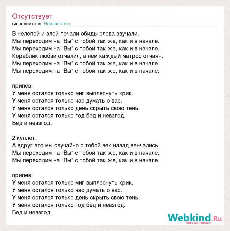В нелепой и злой печали обиды слова звучали. Мы переходим на "Вы" с тобой так же, как и в начале. Мы переходим на "Вы" с тобой так же, как и в начале. Кораблик любви отчалил, в нём каждый матрос отчаян. Мы переходим на "Вы" с тобой так же, как и в начале. Мы переходим на "Вы" с тобой так же, как и в начале. припев: У меня остался только миг выплеснуть крик. У меня остался только час думать о вас. У меня остался только день скрыть свою тень. У меня остался только год бед и невзгод. Бед и невзгод. 2 куплет: А вдруг это мы случайно с тобой век назад венчались. Мы переходим на "Вы" с тобой так же, как и в начале. Мы переходим на "Вы" с тобой так же, как и в начале. припев: У меня остался только миг выплеснуть крик. У меня остался только час думать о вас. У меня остался только день скрыть свою тень. У меня остался только год бед и невзгод. Бед и невзгод.