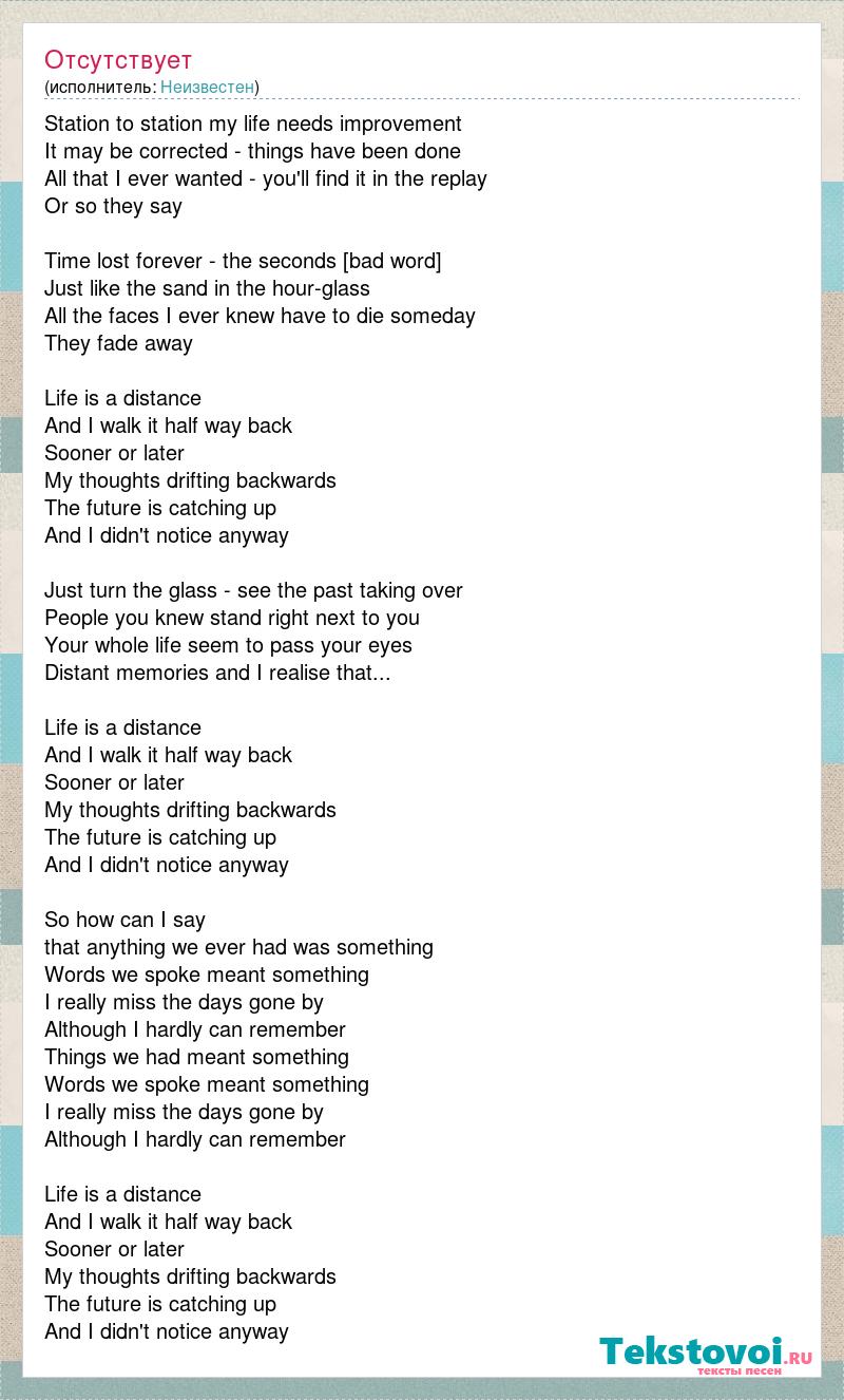 Station to station my life needs improvement It may be corrected - things have been done All that I ever wanted - you'll find it in the replay Or so they say Time lost forever - the seconds [bad word] Just like the sand in the hour-glass All the faces I ever knew have to die someday They fade away Life is a distance And I walk it half way back Sooner or later My thoughts drifting backwards The future is catching up And I didn't notice anyway Just turn the glass - see the past taking over People you knew stand right next to you Your whole life seem to pass your eyes Distant memories and I realise that... Life is a distance And I walk it half way back Sooner or later My thoughts drifting backwards The future is catching up And I didn't notice anyway So how can I say that anything we ever had was something Words we spoke meant something I really miss the days gone by Although I hardly can remember Things we had meant something Words we spoke meant something I really miss the days gone by Although I hardly can remember Life is a distance And I walk it half way back Sooner or later My thoughts drifting backwards The future is catching up And I didn't notice anyway