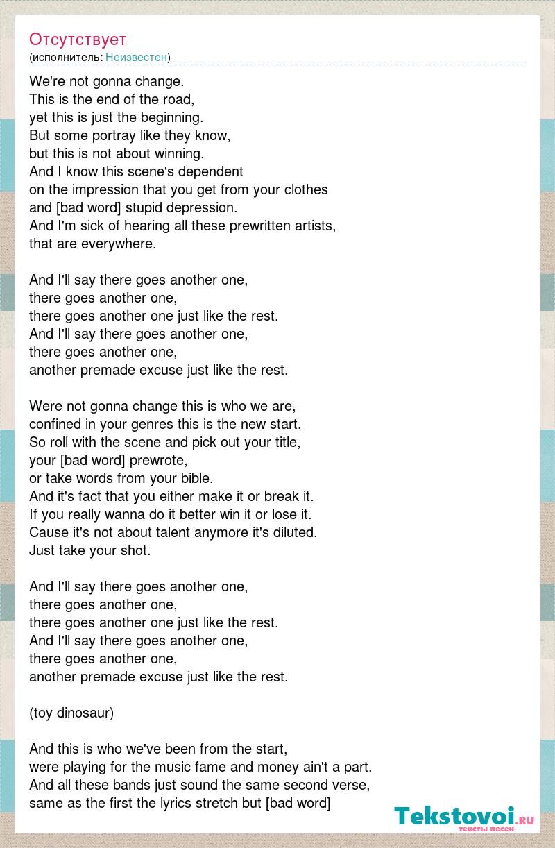 We're not gonna change. This is the end of the road, yet this is just the beginning. But some portray like they know, but this is not about winning. And I know this scene's dependent on the impression that you get from your clothes and [bad word] stupid depression. And I'm sick of hearing all these prewritten artists, that are everywhere. And I'll say there goes another one, there goes another one, there goes another one just like the rest. And I'll say there goes another one, there goes another one, another premade excuse just like the rest. Were not gonna change this is who we are, confined in your genres this is the new start. So roll with the scene and pick out your title, your [bad word] prewrote, or take words from your bible. And it's fact that you either make it or break it. If you really wanna do it better win it or lose it. Cause it's not about talent anymore it's diluted. Just take your shot. And I'll say there goes another one, there goes another one, there goes another one just like the rest. And I'll say there goes another one, there goes another one, another premade excuse just like the rest. (toy dinosaur) And this is who we've been from the start, were playing for the music fame and money ain't a part. And all these bands just sound the same second verse, same as the first the lyrics stretch but [bad word]