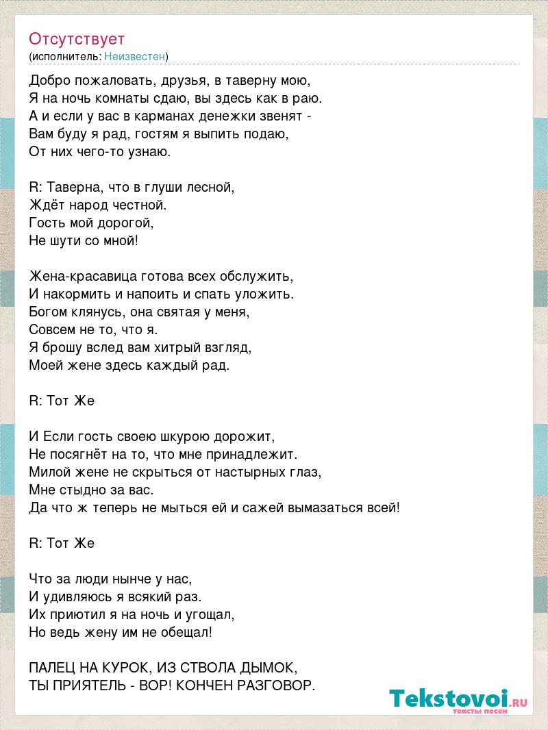 Добро пожаловать, друзья, в таверну мою, Я на ночь комнаты сдаю, вы здесь как в раю. А и если у вас в карманах денежки звенят - Вам буду я рад, гостям я выпить подаю, От них чего-то узнаю. R: Таверна, что в глуши лесной, Ждёт народ честной. Гость мой дорогой, Не шути со мной! Жена-красавица готова всех обслужить, И накормить и напоить и спать уложить. Богом клянусь, она святая у меня, Совсем не то, что я. Я брошу вслед вам хитрый взгляд, Моей жене здесь каждый рад. R: Тот Же И Если гость своею шкурою дорожит, Не посягнёт на то, что мне принадлежит. Милой жене не скрыться от настырных глаз, Мне стыдно за вас. Да что ж теперь не мыться ей и сажей вымазаться всей! R: Тот Же Что за люди нынче у нас, И удивляюсь я всякий раз. Их приютил я на ночь и угощал, Но ведь жену им не обещал! ПАЛЕЦ НА КУРОК, ИЗ СТВОЛА ДЫМОК, ТЫ ПРИЯТЕЛЬ - ВОР! КОНЧЕН РАЗГОВОР.
